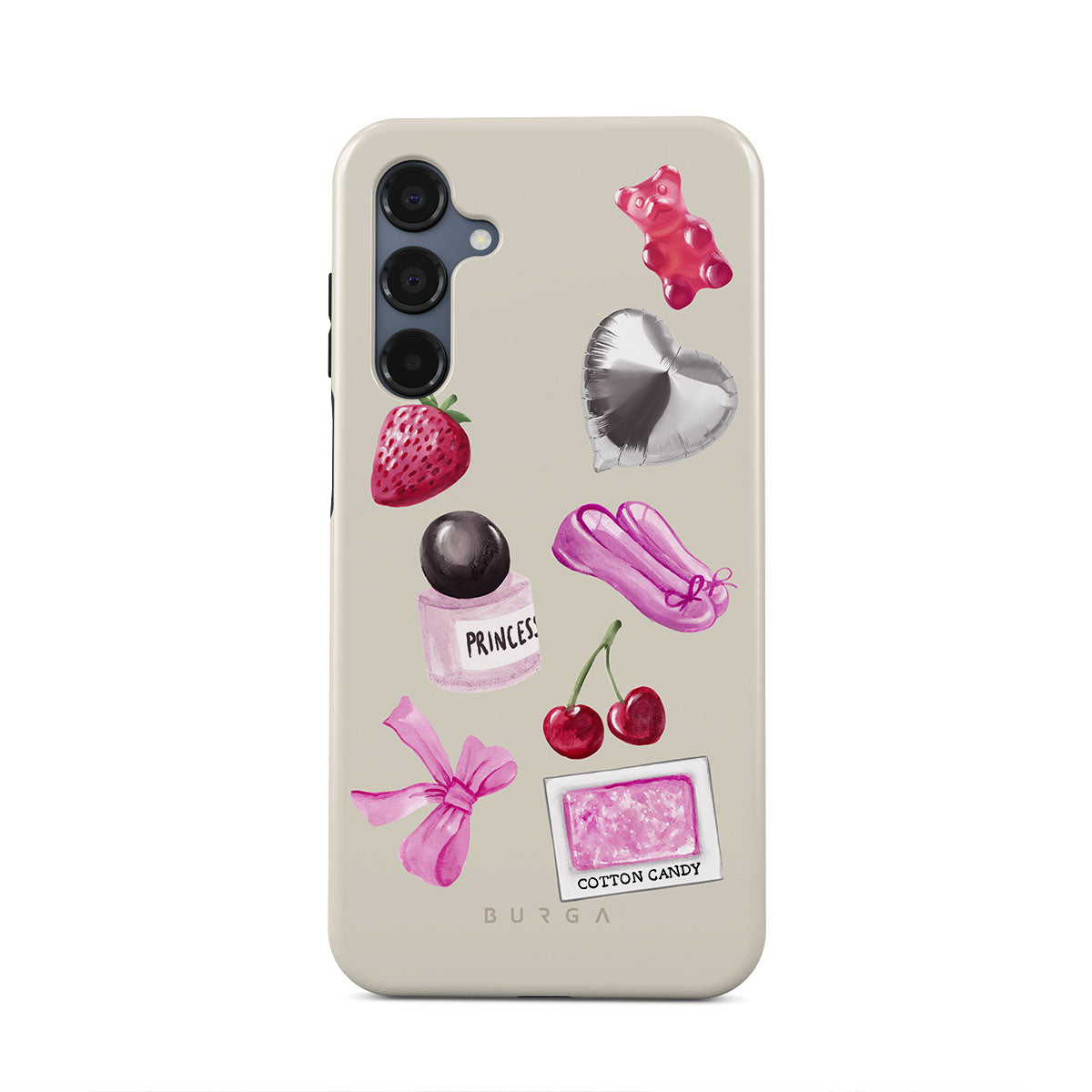 Kenmerken van dit design: roze strik, zilveren hartvormige ballon, parfumflesje, aardbei, kersen, roze balletschoenen, suikerspin-sticker, roze gummybeer.