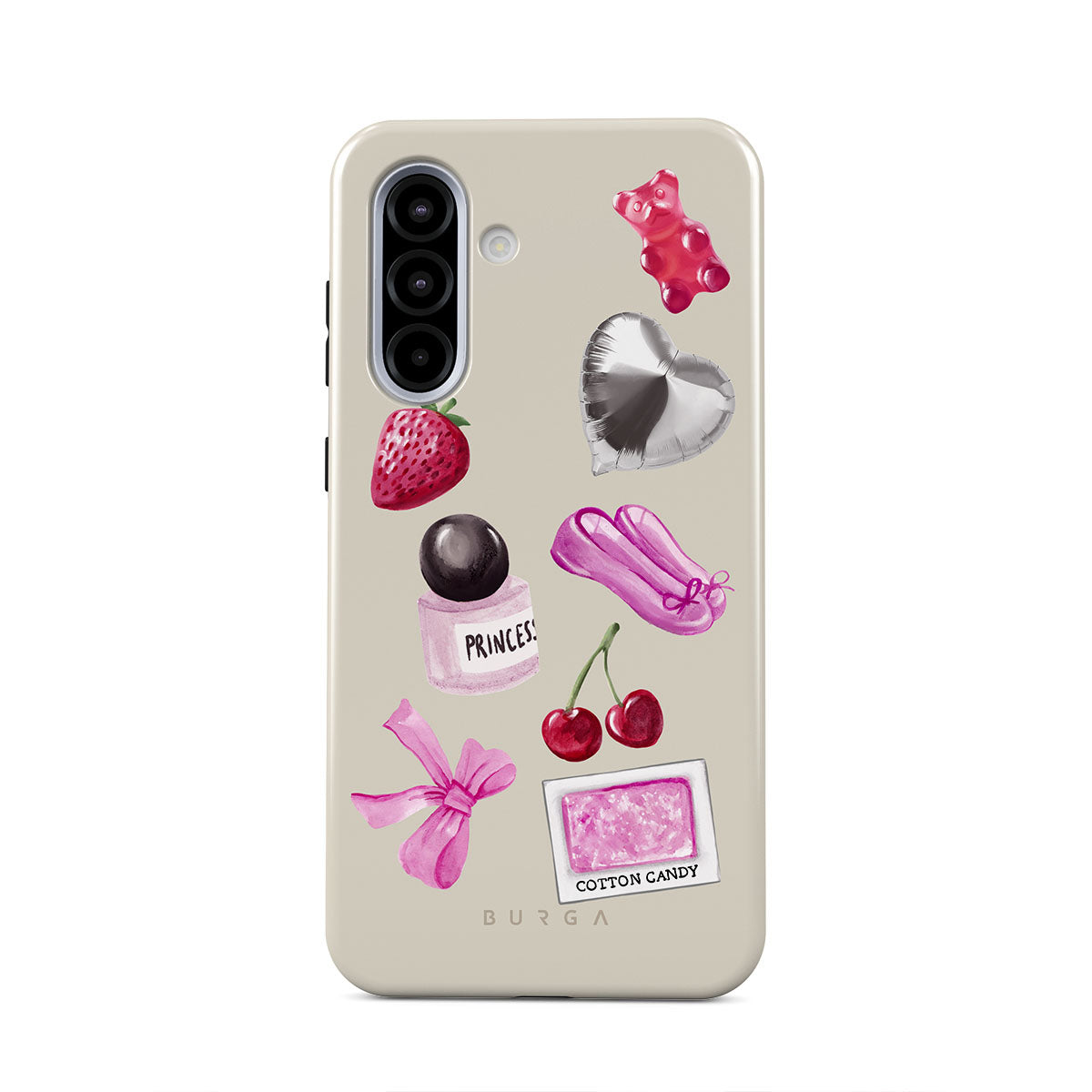 Kenmerken van dit design: roze strik, zilveren hartvormige ballon, parfumflesje, aardbei, kersen, roze balletschoenen, suikerspin-sticker, roze gummybeer.