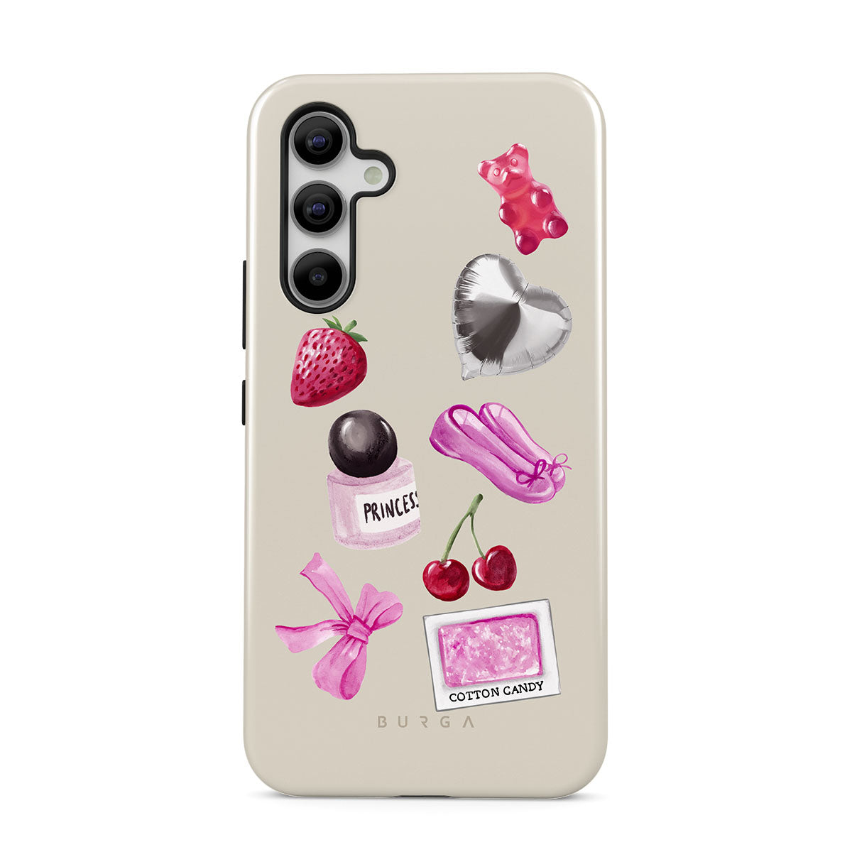 Kenmerken van dit design: roze strik, zilveren hartvormige ballon, parfumflesje, aardbei, kersen, roze balletschoenen, suikerspin-sticker, roze gummybeer.