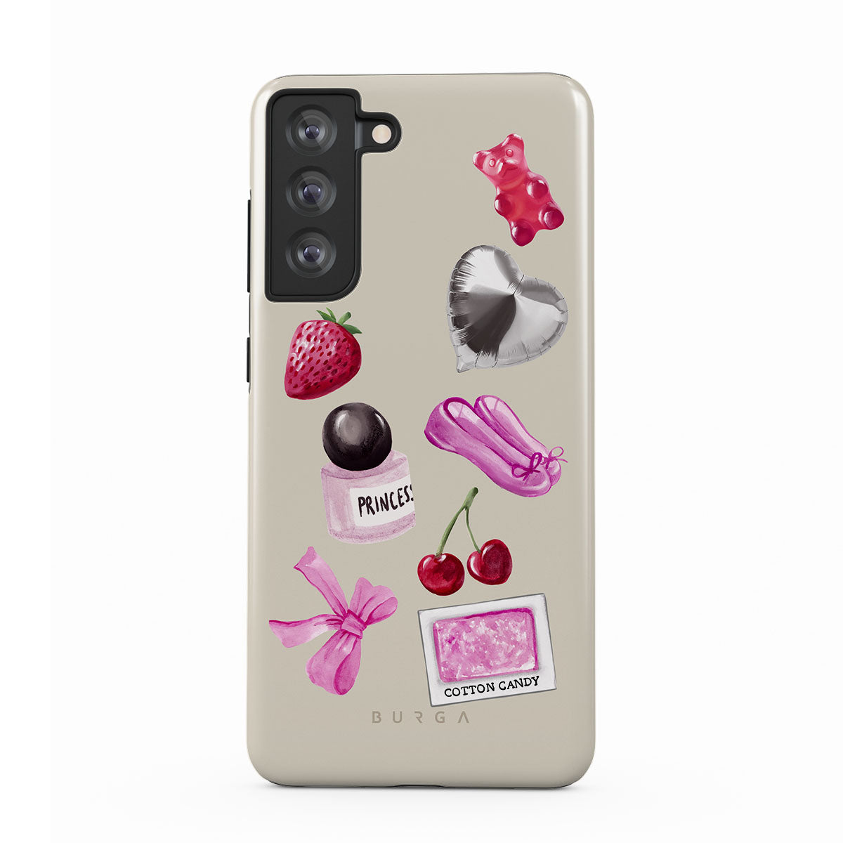 Kenmerken van dit design: roze strik, zilveren hartvormige ballon, parfumflesje, aardbei, kersen, roze balletschoenen, suikerspin-sticker, roze gummybeer.