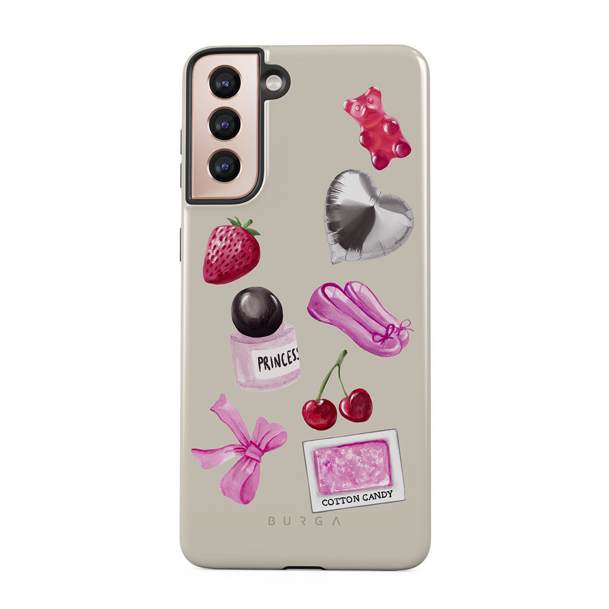 Kenmerken van dit design: roze strik, zilveren hartvormige ballon, parfumflesje, aardbei, kersen, roze balletschoenen, suikerspin-sticker, roze gummybeer.