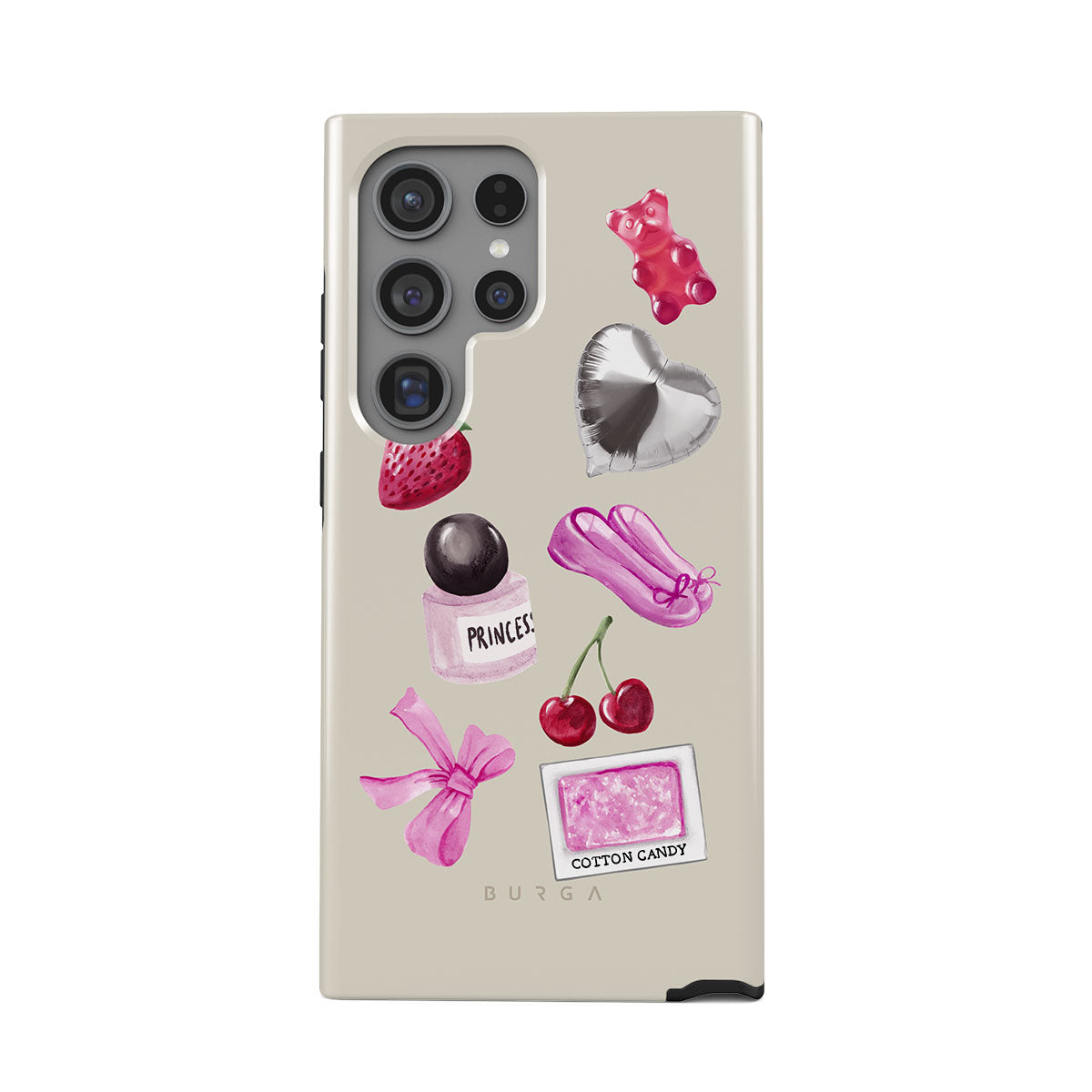 Kenmerken van dit design: roze strik, zilveren hartvormige ballon, parfumflesje, aardbei, kersen, roze balletschoenen, suikerspin-sticker, roze gummybeer.