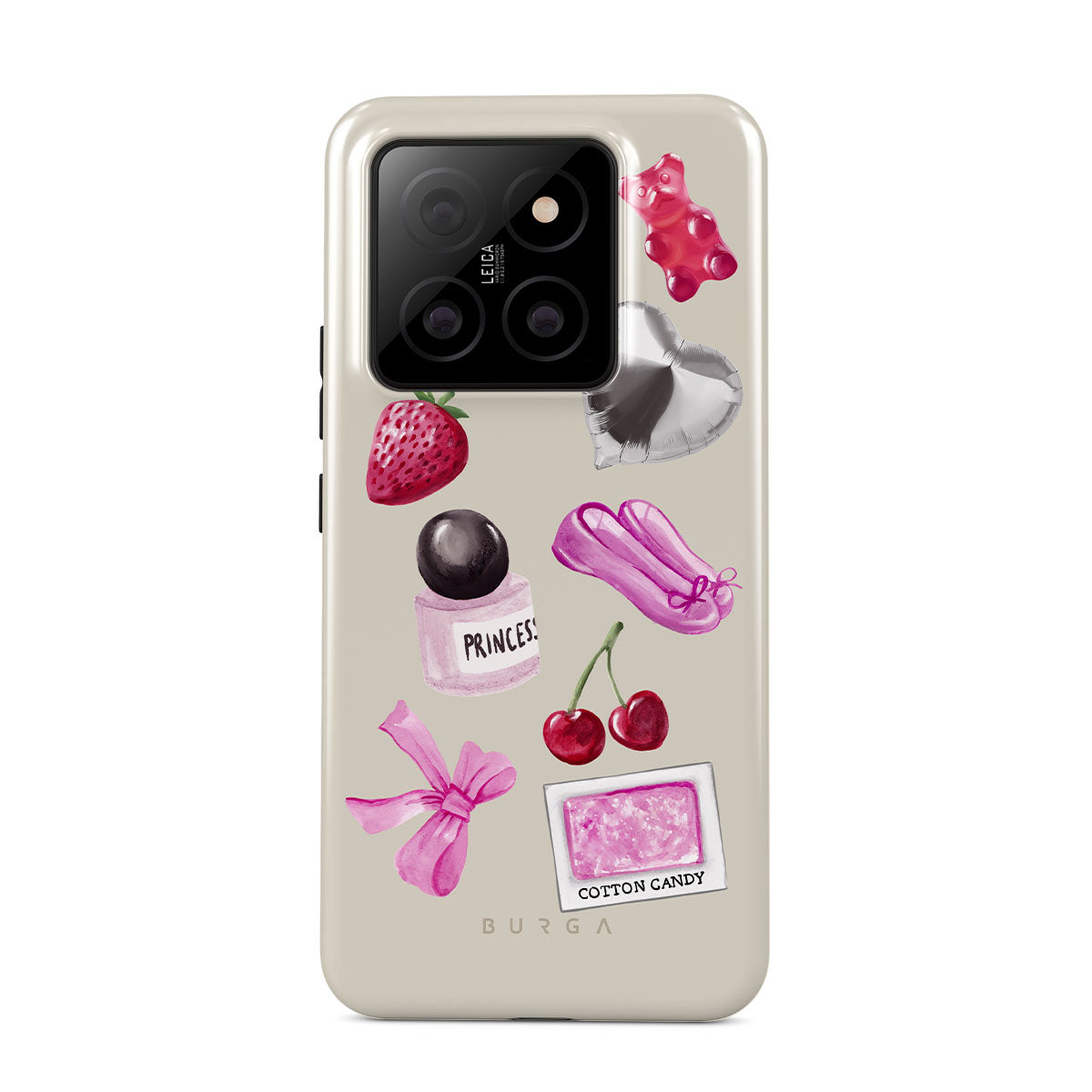 Kenmerken van dit design: roze strik, zilveren hartvormige ballon, parfumflesje, aardbei, kersen, roze balletschoenen, suikerspin-sticker, roze gummybeer.