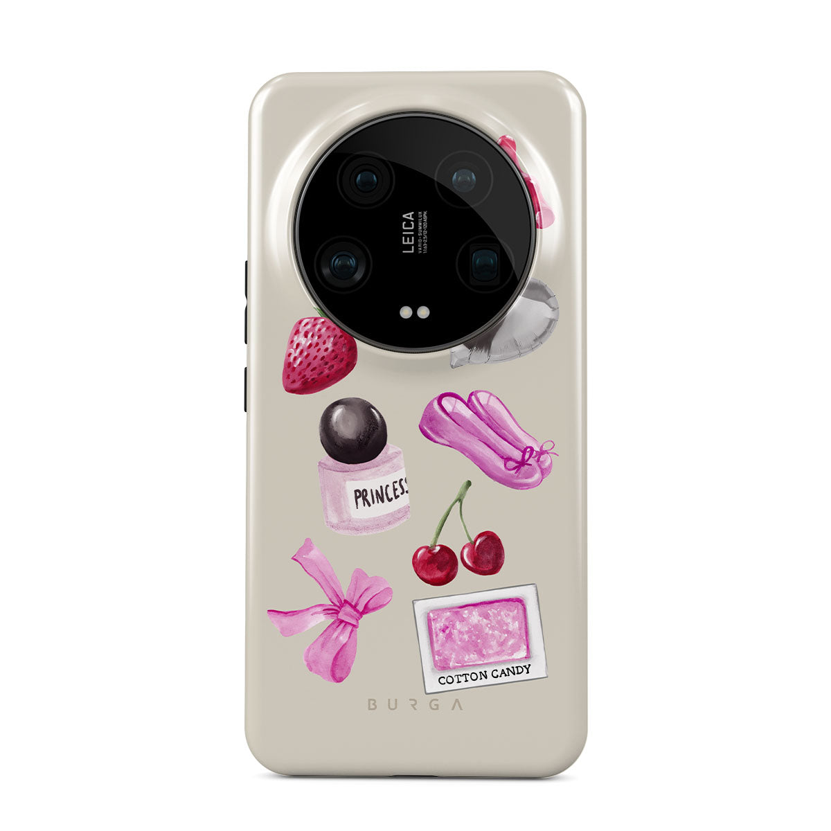 Kenmerken van dit design: roze strik, zilveren hartvormige ballon, parfumflesje, aardbei, kersen, roze balletschoenen, suikerspin-sticker, roze gummybeer.