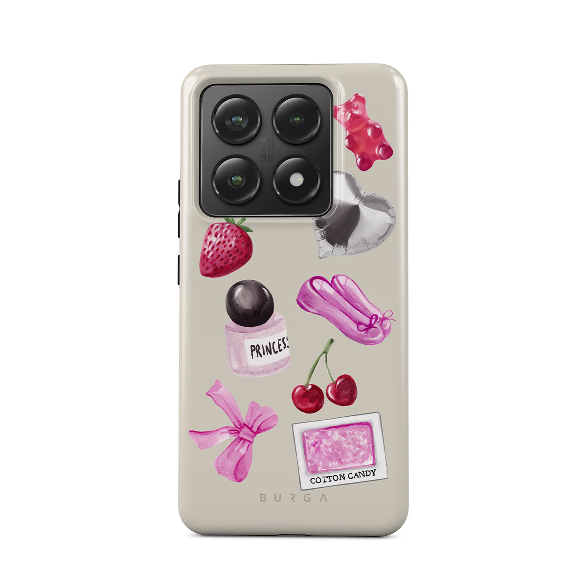Kenmerken van dit design: roze strik, zilveren hartvormige ballon, parfumflesje, aardbei, kersen, roze balletschoenen, suikerspin-sticker, roze gummybeer.