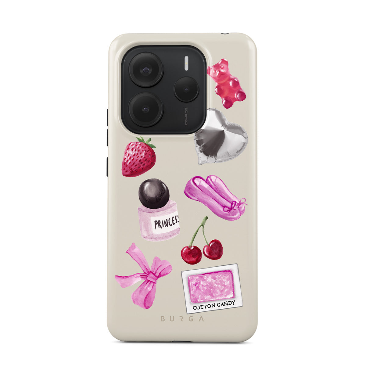 Kenmerken van dit design: roze strik, zilveren hartvormige ballon, parfumflesje, aardbei, kersen, roze balletschoenen, suikerspin-sticker, roze gummybeer.
