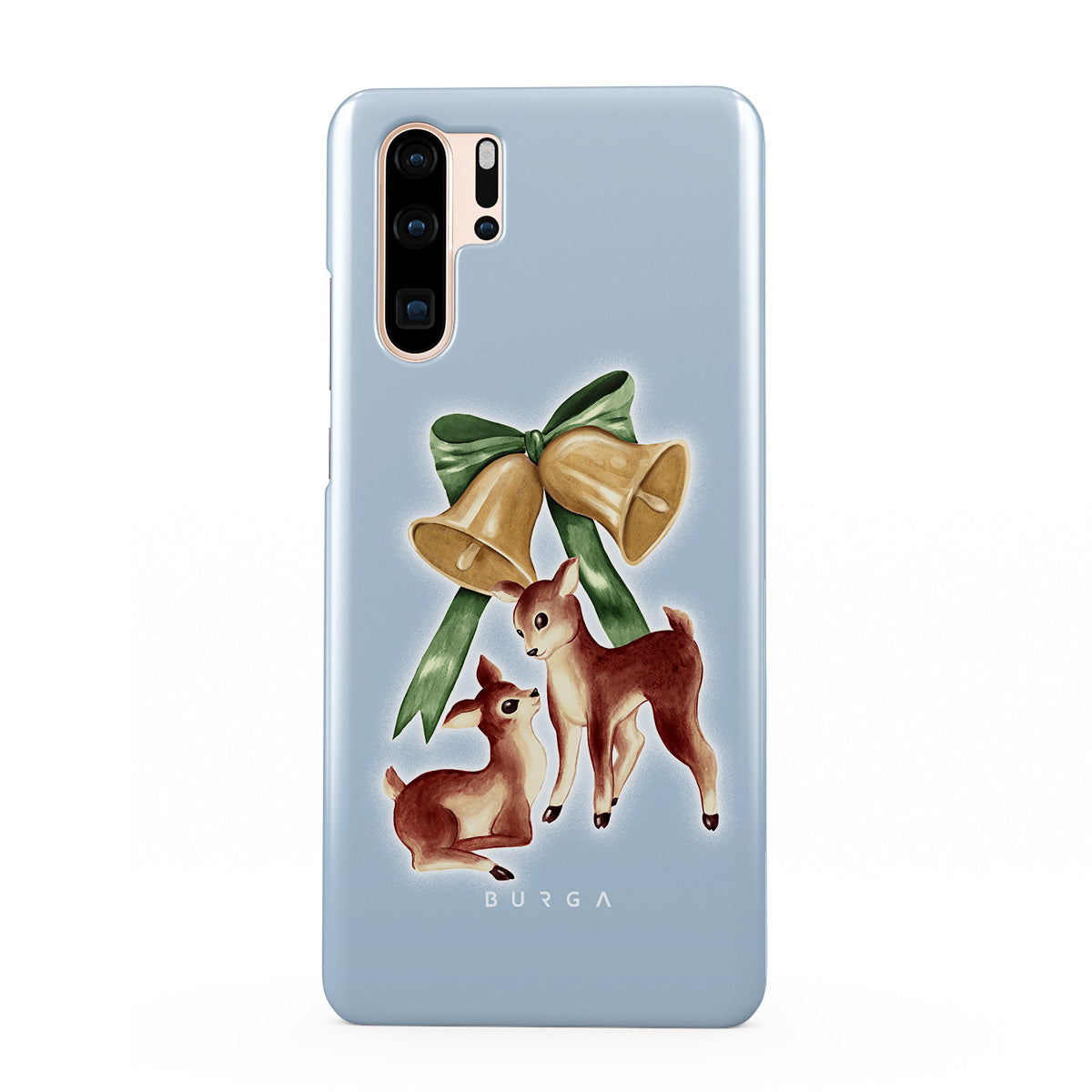 Kenmerken van dit design: vintage rendier, kerstklokken, gouden klokken, retro rendierillustratie, babyhert, lichtblauwe achtergrond