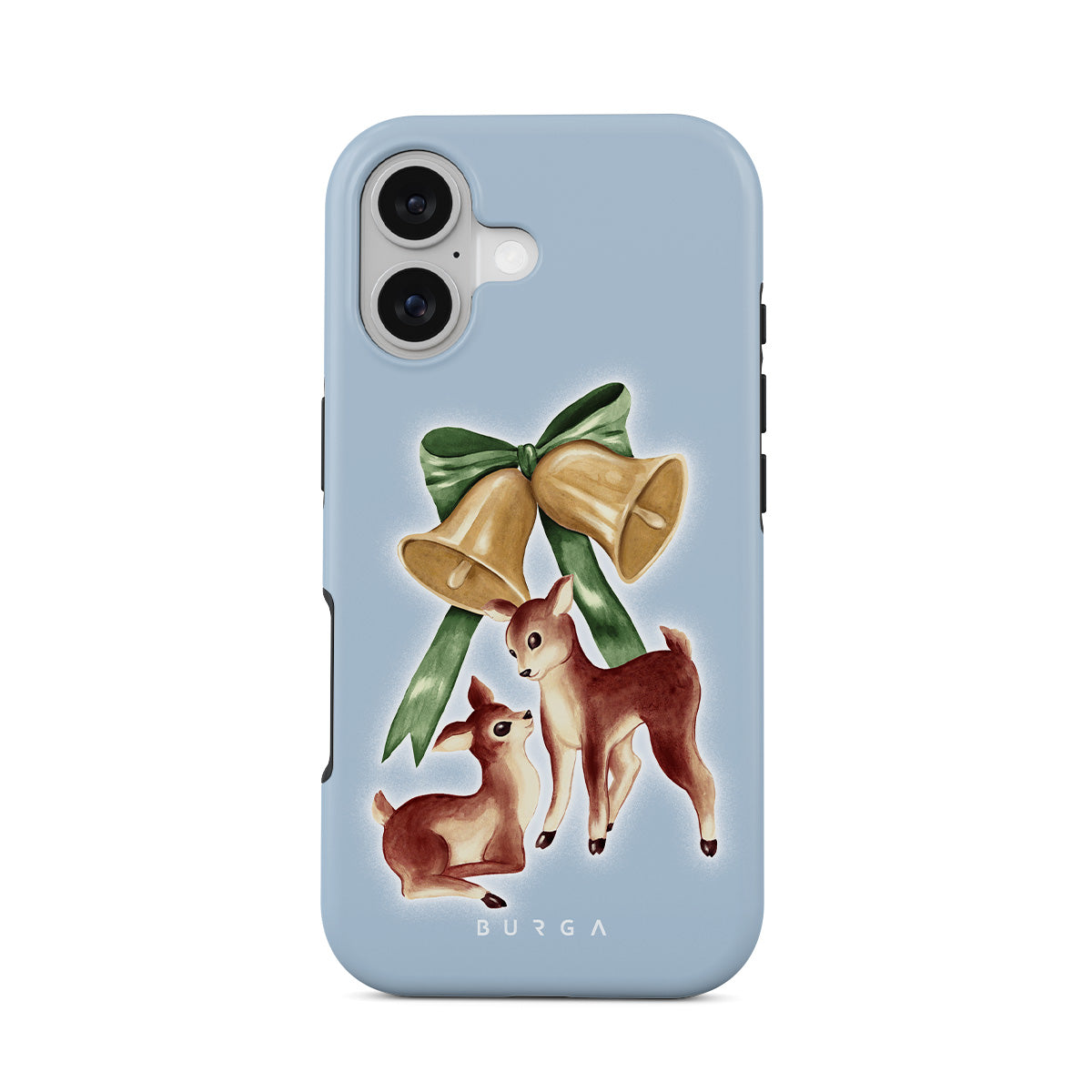 Kenmerken van dit design: vintage rendier, kerstklokken, gouden klokken, retro rendierillustratie, babyhert, lichtblauwe achtergrond