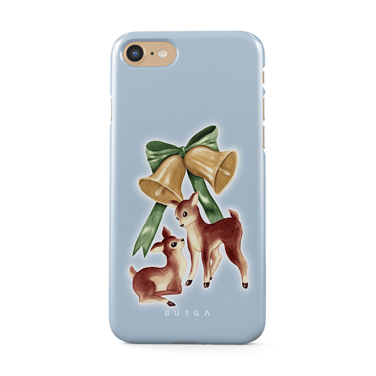 Kenmerken van dit design: vintage rendier, kerstklokken, gouden klokken, retro rendierillustratie, babyhert, lichtblauwe achtergrond