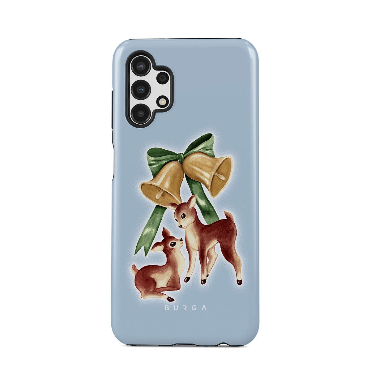 Kenmerken van dit design: vintage rendier, kerstklokken, gouden klokken, retro rendierillustratie, babyhert, lichtblauwe achtergrond