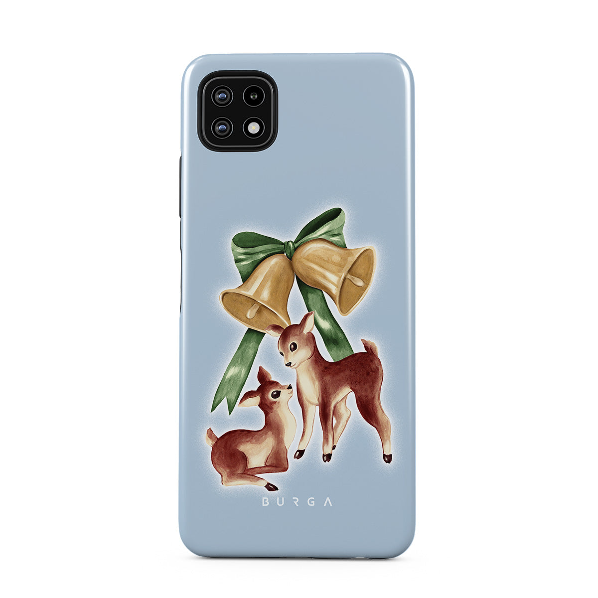 Kenmerken van dit design: vintage rendier, kerstklokken, gouden klokken, retro rendierillustratie, babyhert, lichtblauwe achtergrond