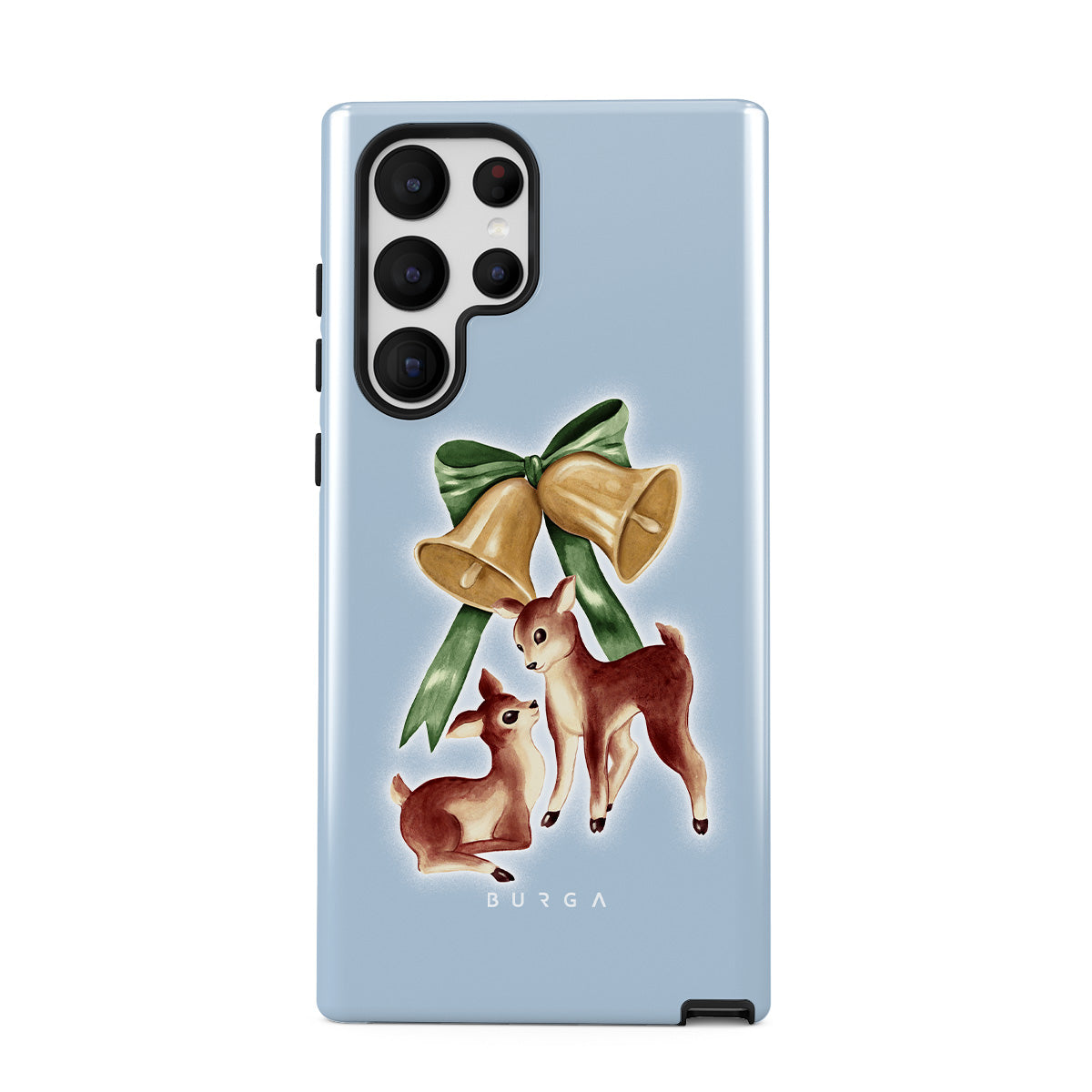 Kenmerken van dit design: vintage rendier, kerstklokken, gouden klokken, retro rendierillustratie, babyhert, lichtblauwe achtergrond