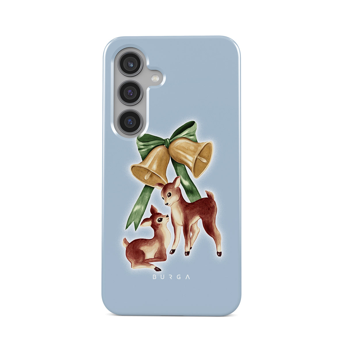 Kenmerken van dit design: vintage rendier, kerstklokken, gouden klokken, retro rendierillustratie, babyhert, lichtblauwe achtergrond