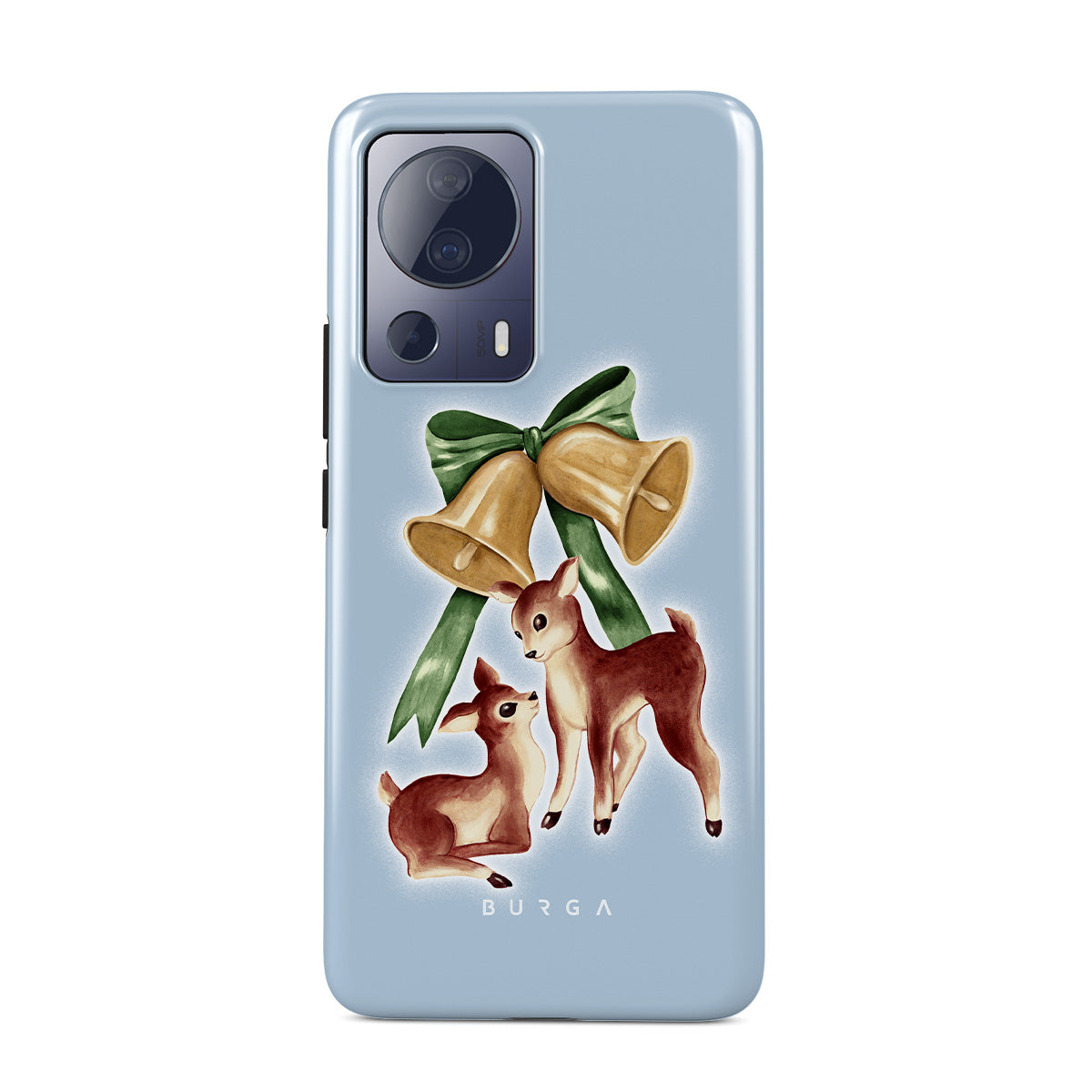 Kenmerken van dit design: vintage rendier, kerstklokken, gouden klokken, retro rendierillustratie, babyhert, lichtblauwe achtergrond