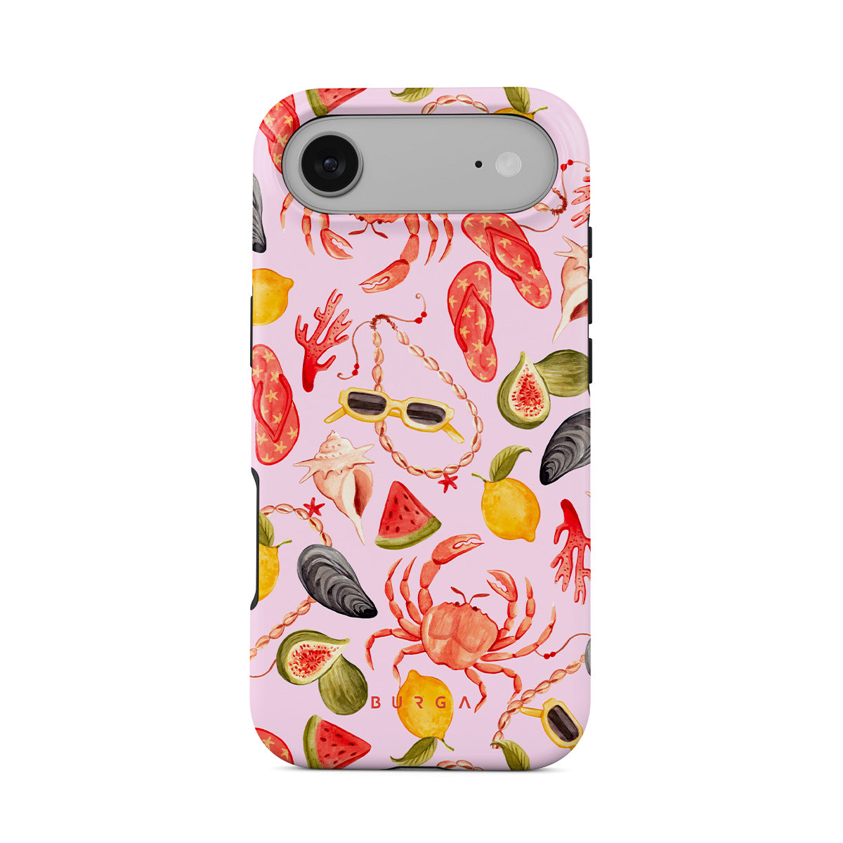 Kenmerken van dit design: watermeloen, zonnebrillen, zeevruchten, krab, slippers, oesters, citroen, levendige kleuren, tropisch thema