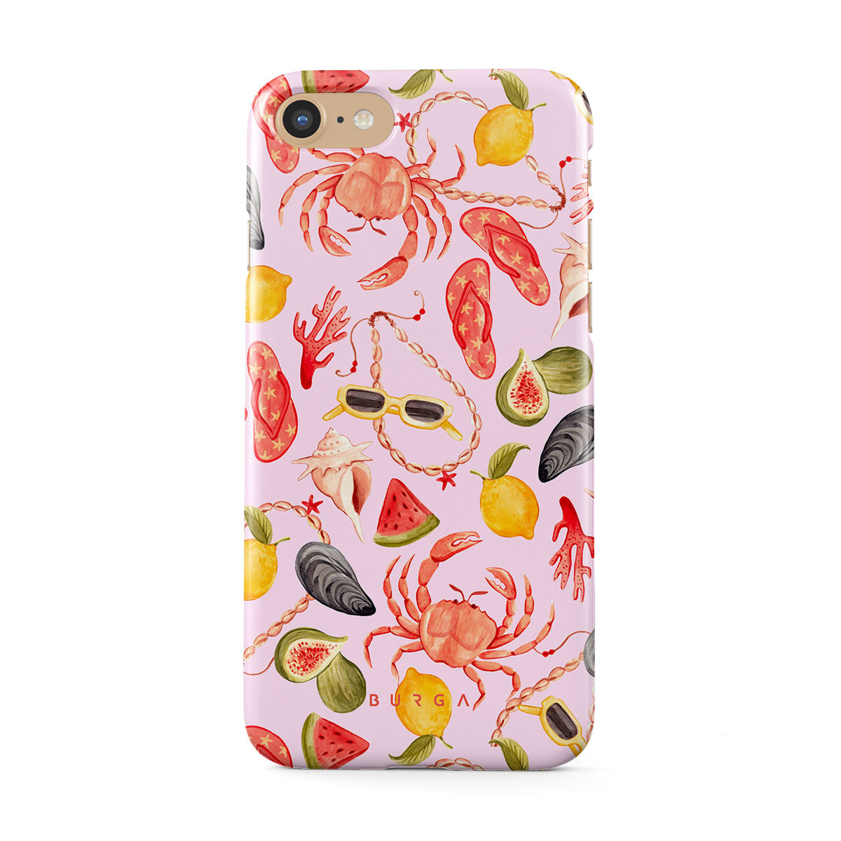 Kenmerken van dit design: watermeloen, zonnebrillen, zeevruchten, krab, slippers, oesters, citroen, levendige kleuren, tropisch thema