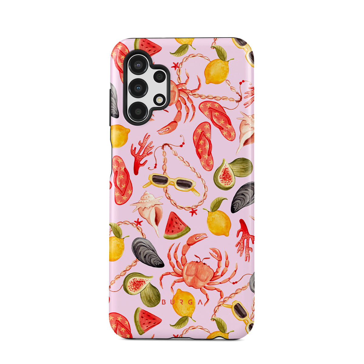 Kenmerken van dit design: watermeloen, zonnebrillen, zeevruchten, krab, slippers, oesters, citroen, levendige kleuren, tropisch thema