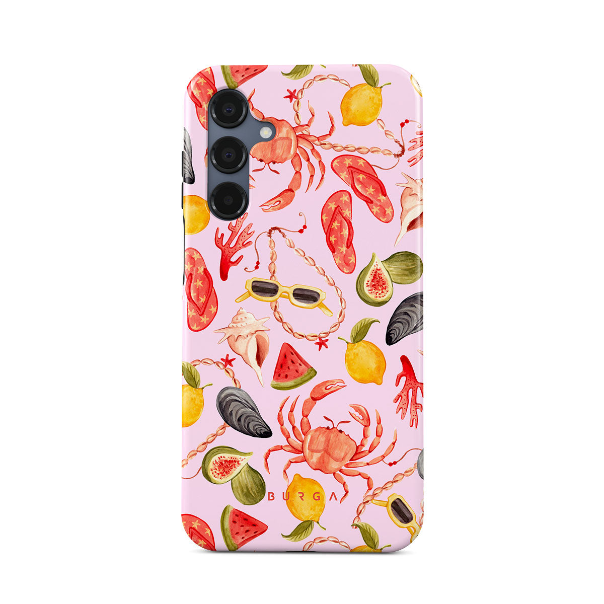 Kenmerken van dit design: watermeloen, zonnebrillen, zeevruchten, krab, slippers, oesters, citroen, levendige kleuren, tropisch thema