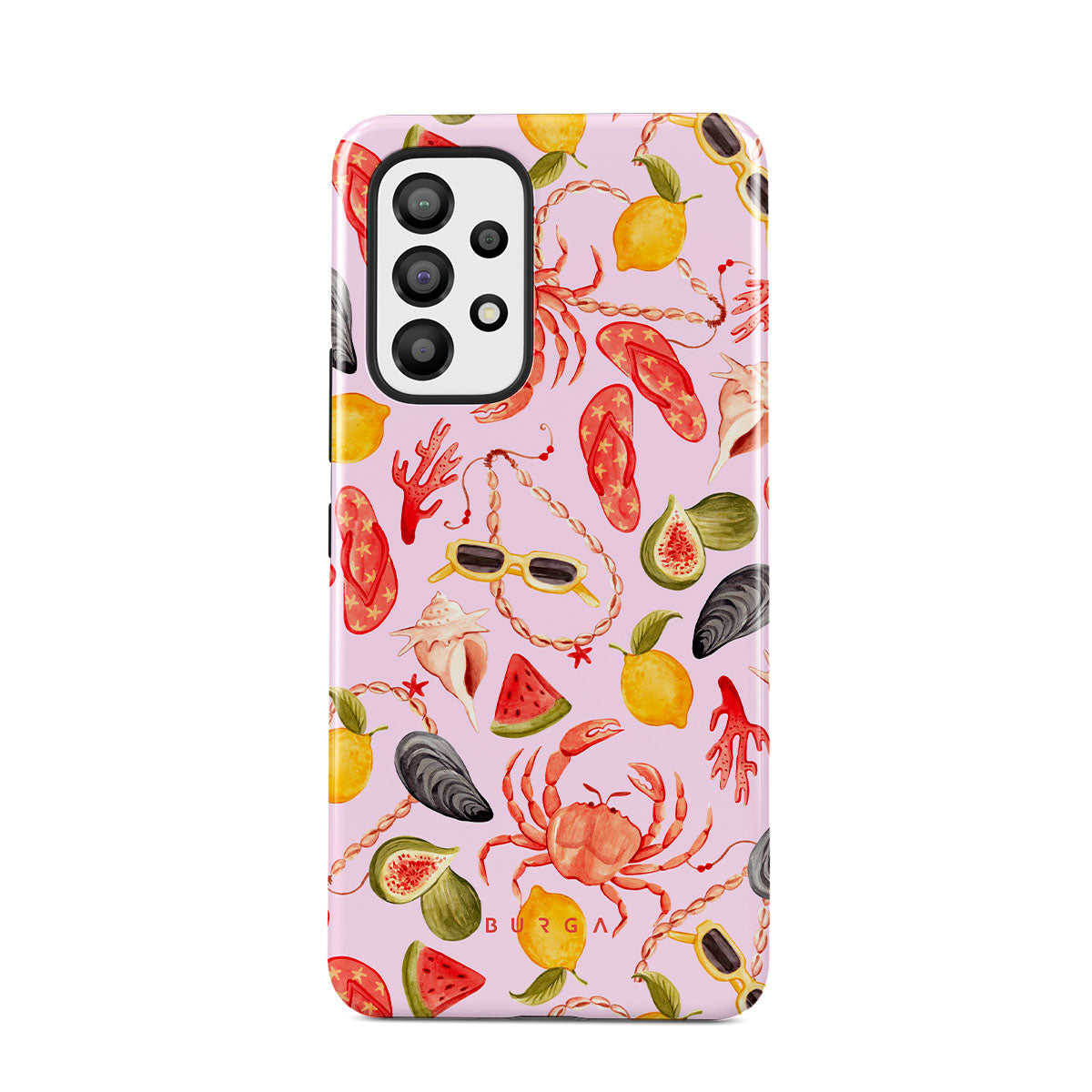 Kenmerken van dit design: watermeloen, zonnebrillen, zeevruchten, krab, slippers, oesters, citroen, levendige kleuren, tropisch thema
