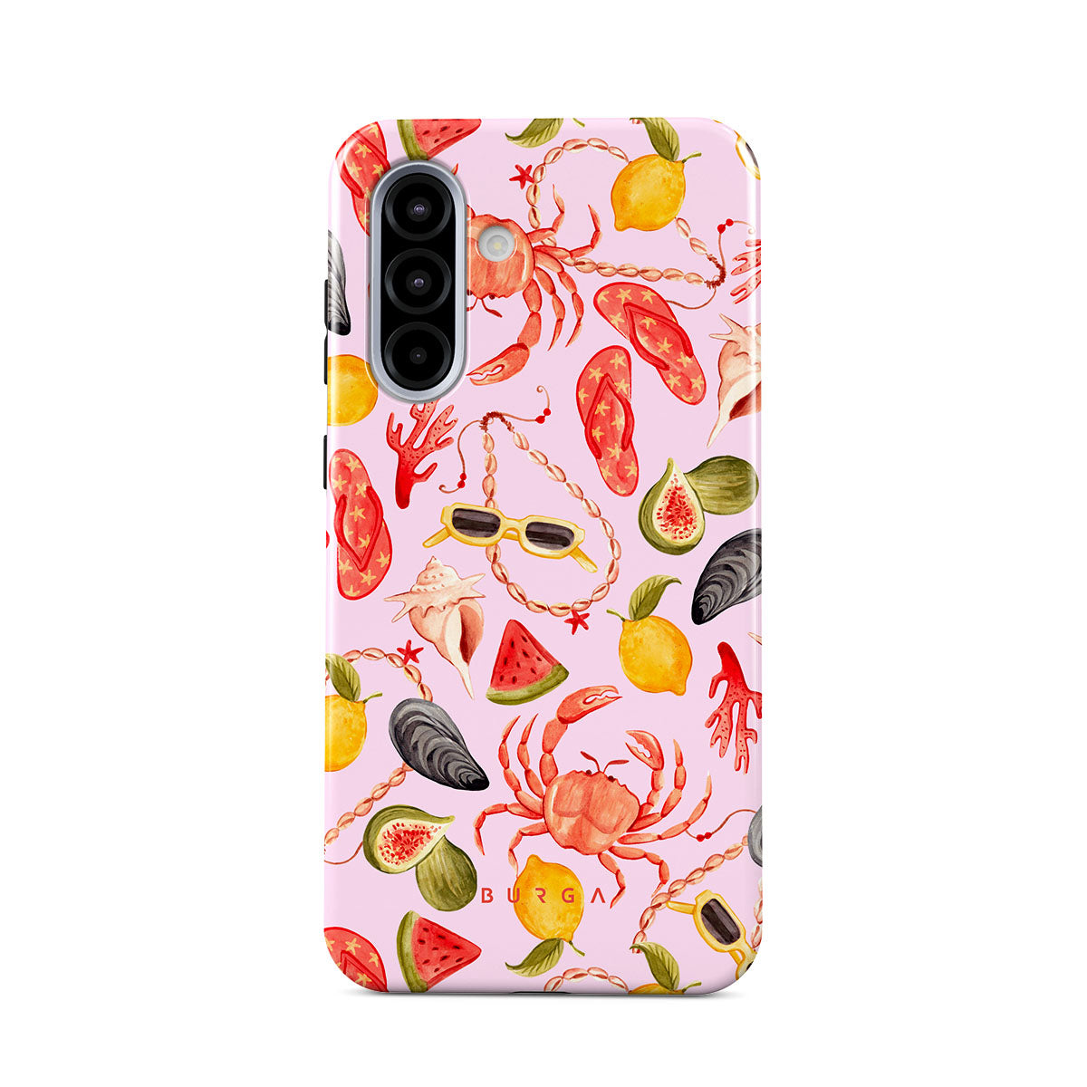 Kenmerken van dit design: watermeloen, zonnebrillen, zeevruchten, krab, slippers, oesters, citroen, levendige kleuren, tropisch thema