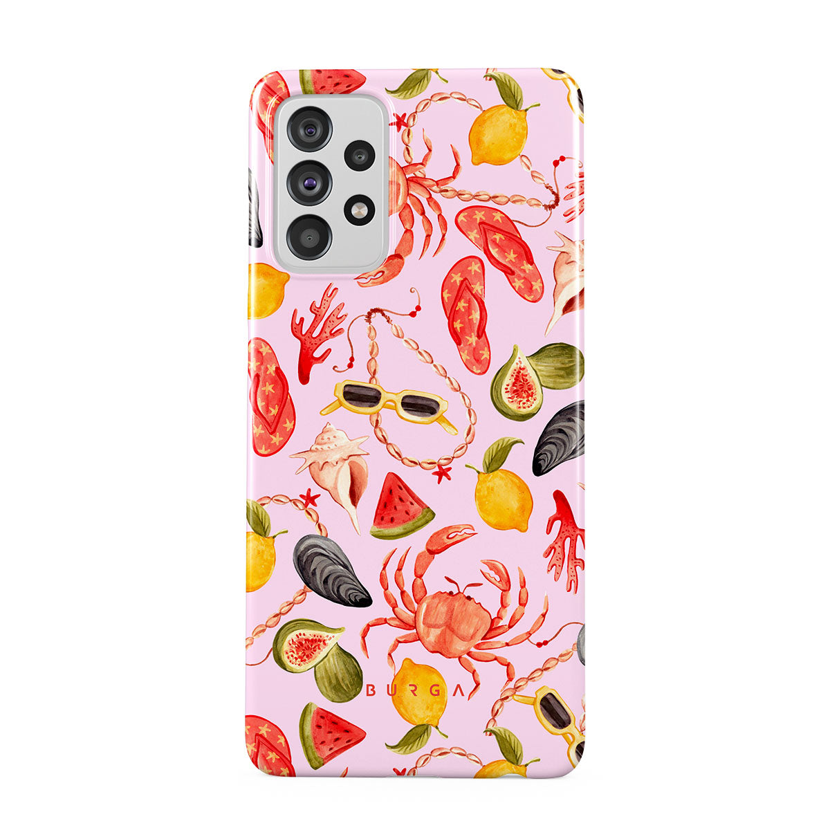 Kenmerken van dit design: watermeloen, zonnebrillen, zeevruchten, krab, slippers, oesters, citroen, levendige kleuren, tropisch thema