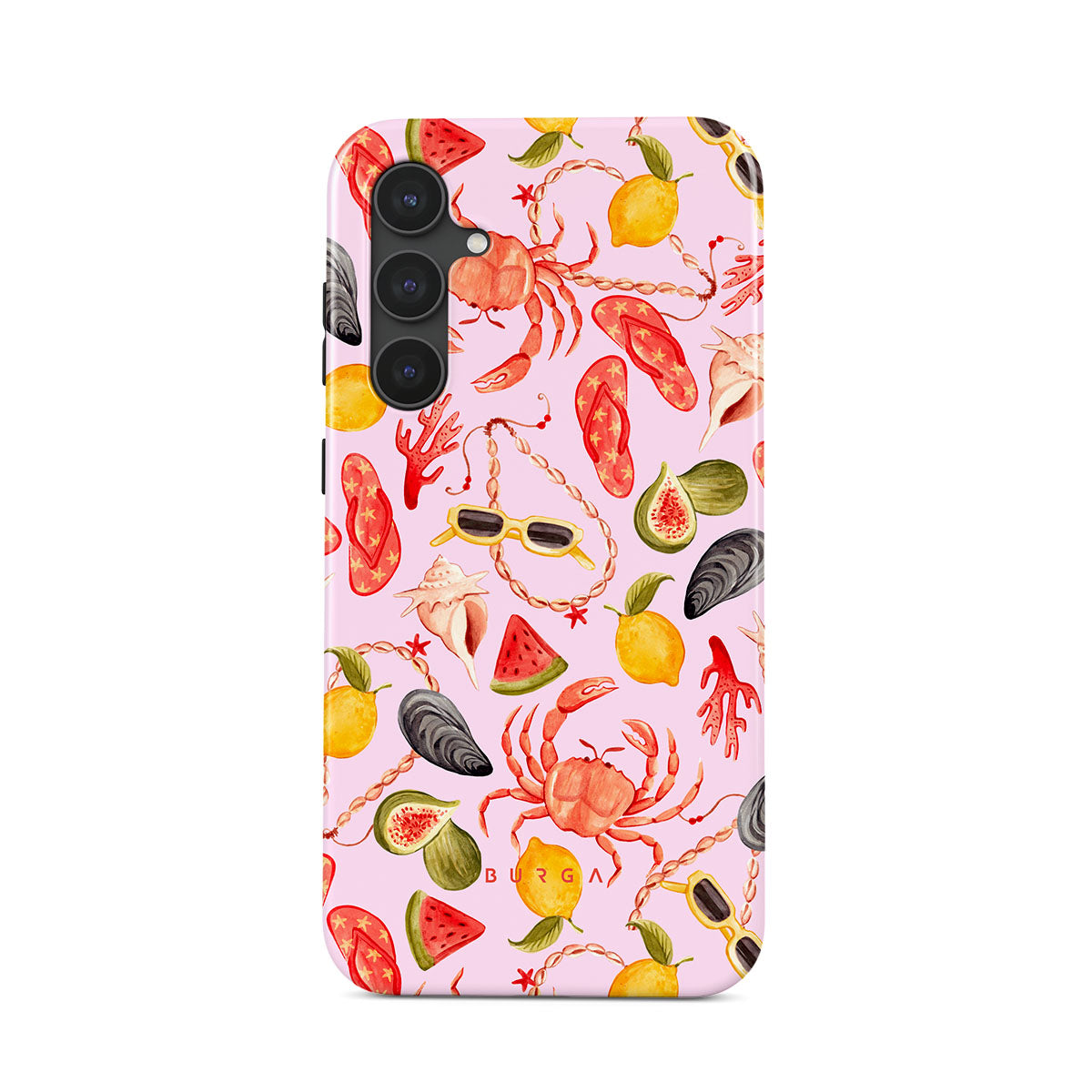 Kenmerken van dit design: watermeloen, zonnebrillen, zeevruchten, krab, slippers, oesters, citroen, levendige kleuren, tropisch thema