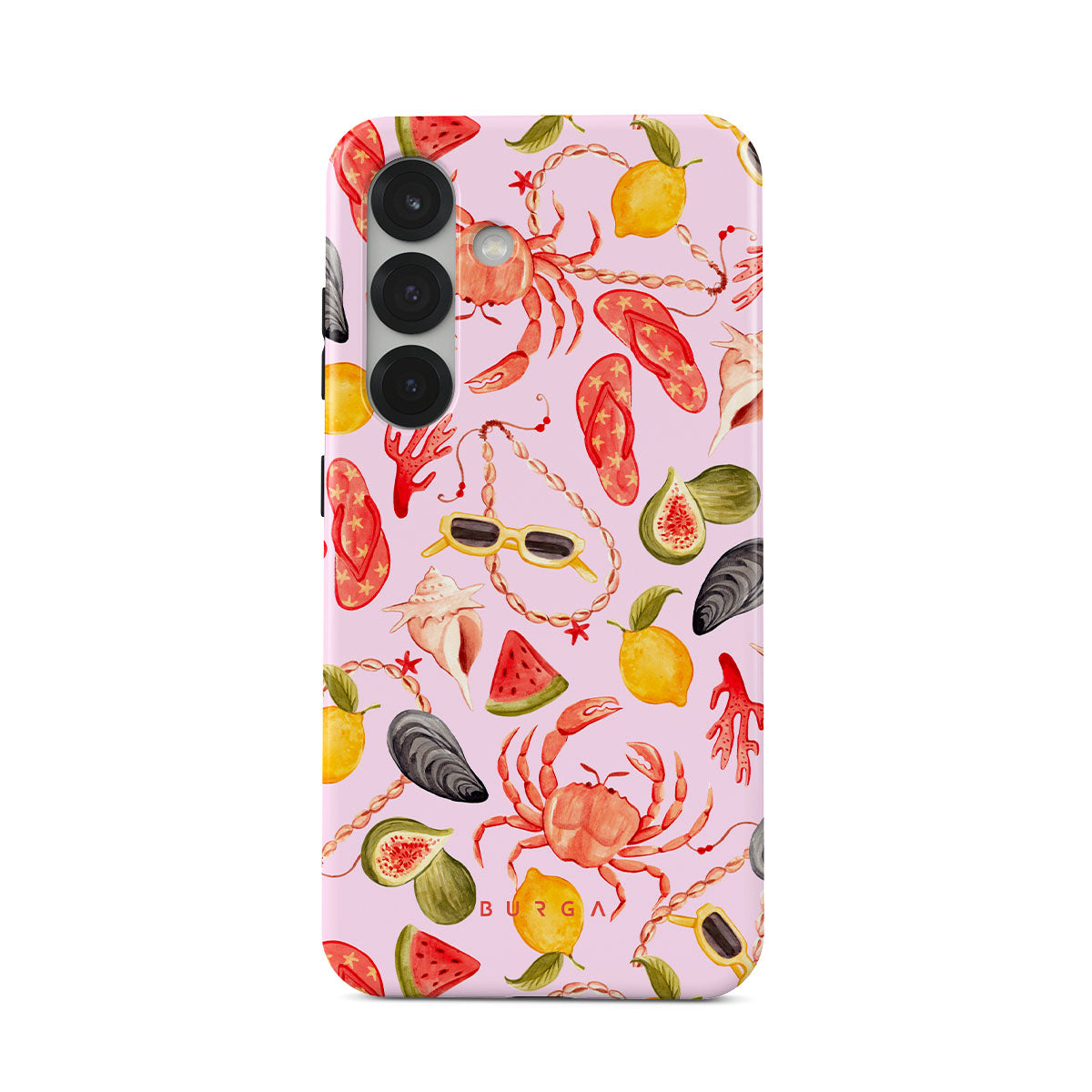 Kenmerken van dit design: watermeloen, zonnebrillen, zeevruchten, krab, slippers, oesters, citroen, levendige kleuren, tropisch thema