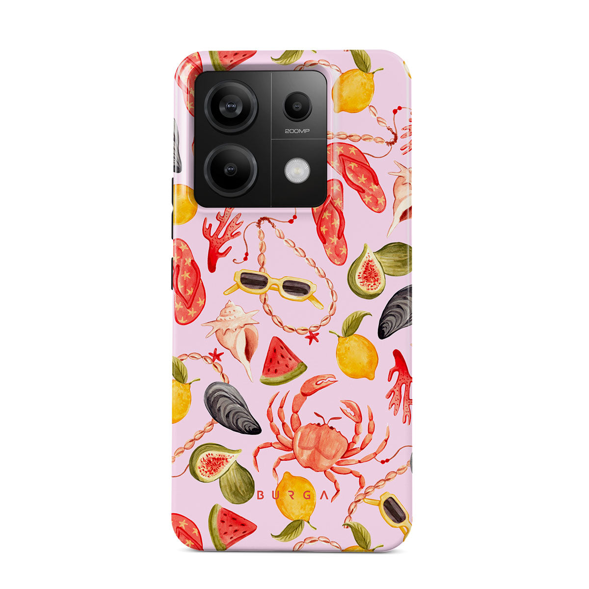 Kenmerken van dit design: watermeloen, zonnebrillen, zeevruchten, krab, slippers, oesters, citroen, levendige kleuren, tropisch thema