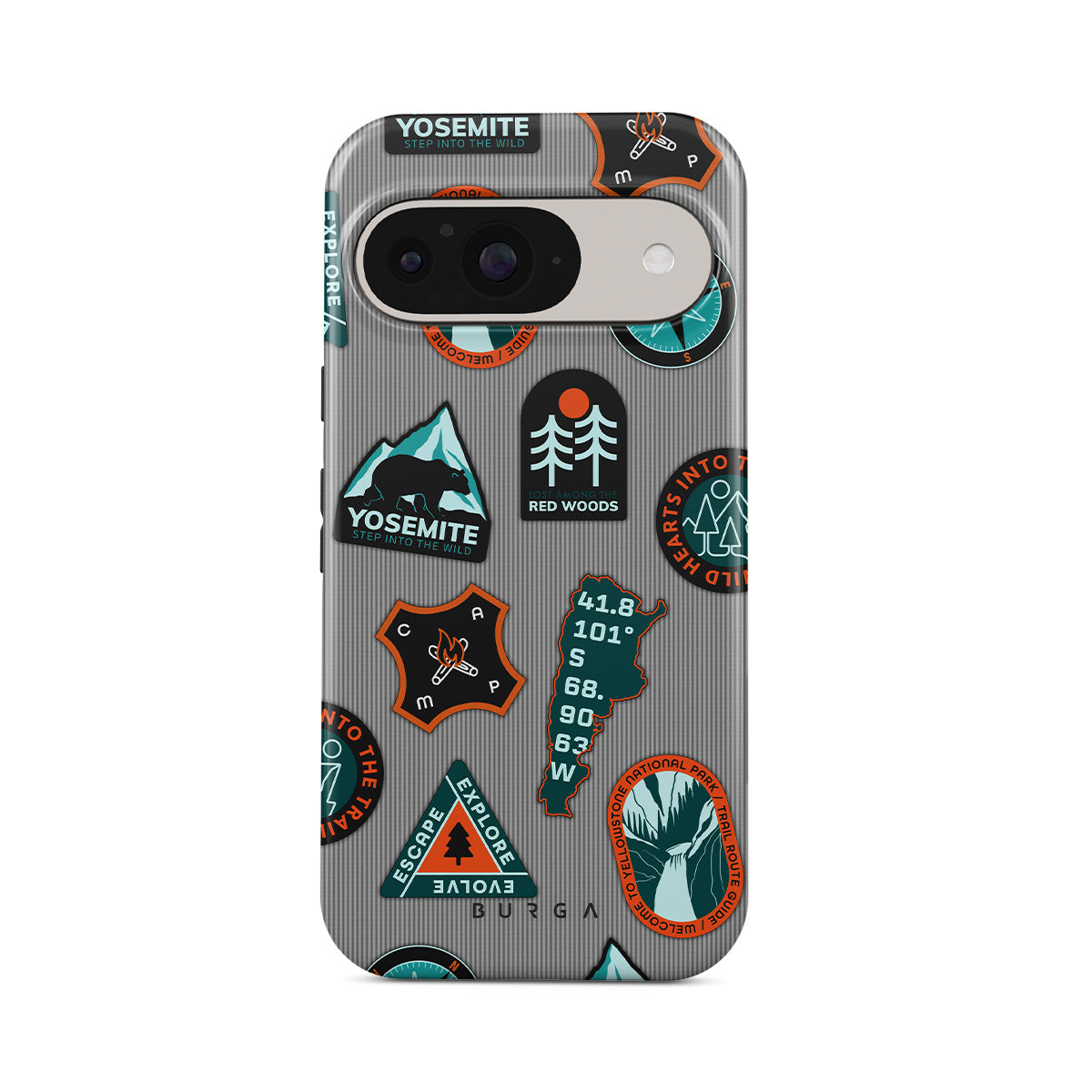 Kenmerken van dit design: outdoorpatches, natuur, bergen, avontuur, vintage, badges