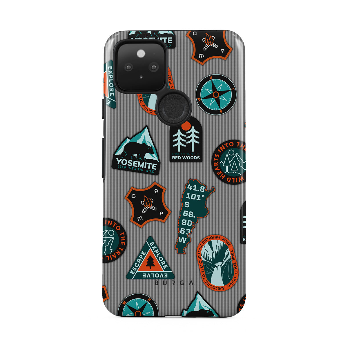 Kenmerken van dit design: outdoorpatches, natuur, bergen, avontuur, vintage, badges