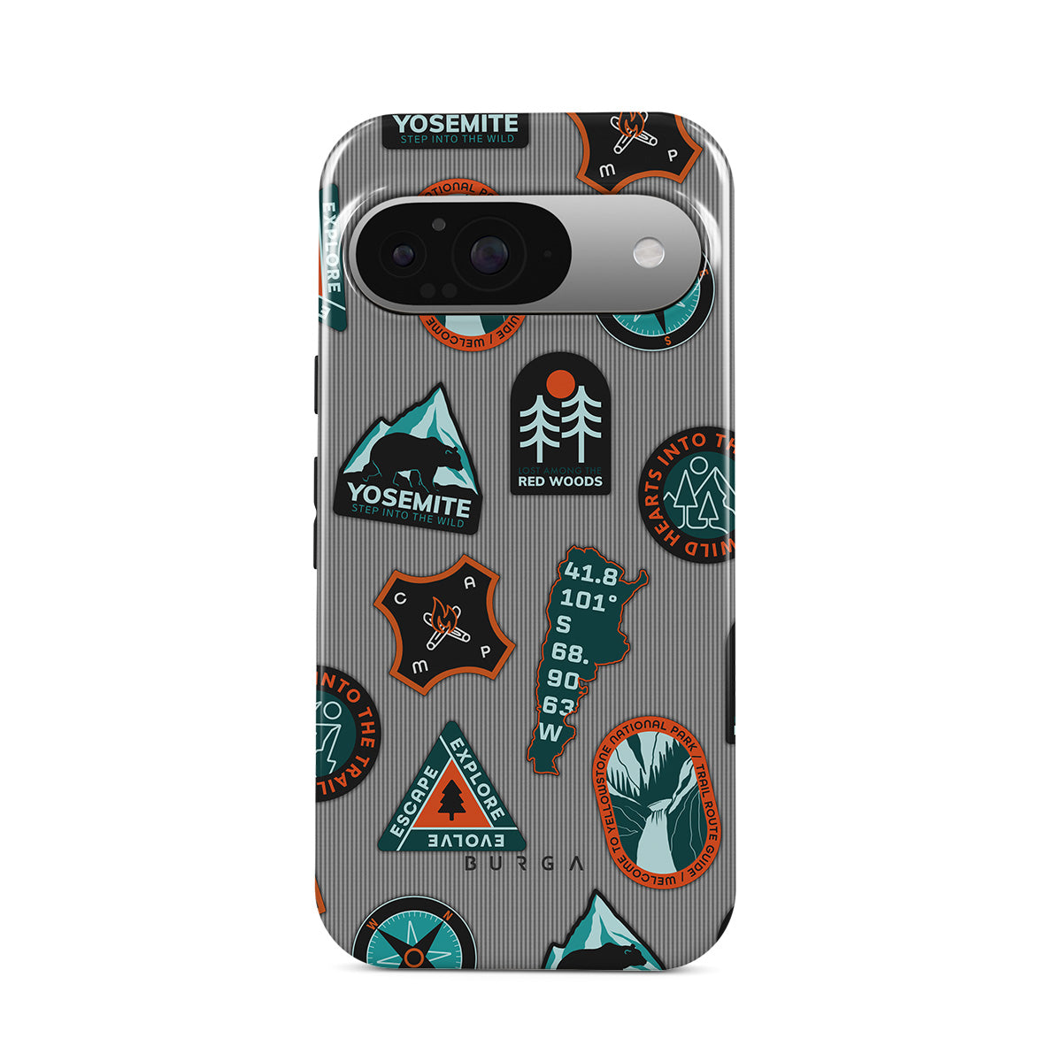 Kenmerken van dit design: outdoorpatches, natuur, bergen, avontuur, vintage, badges