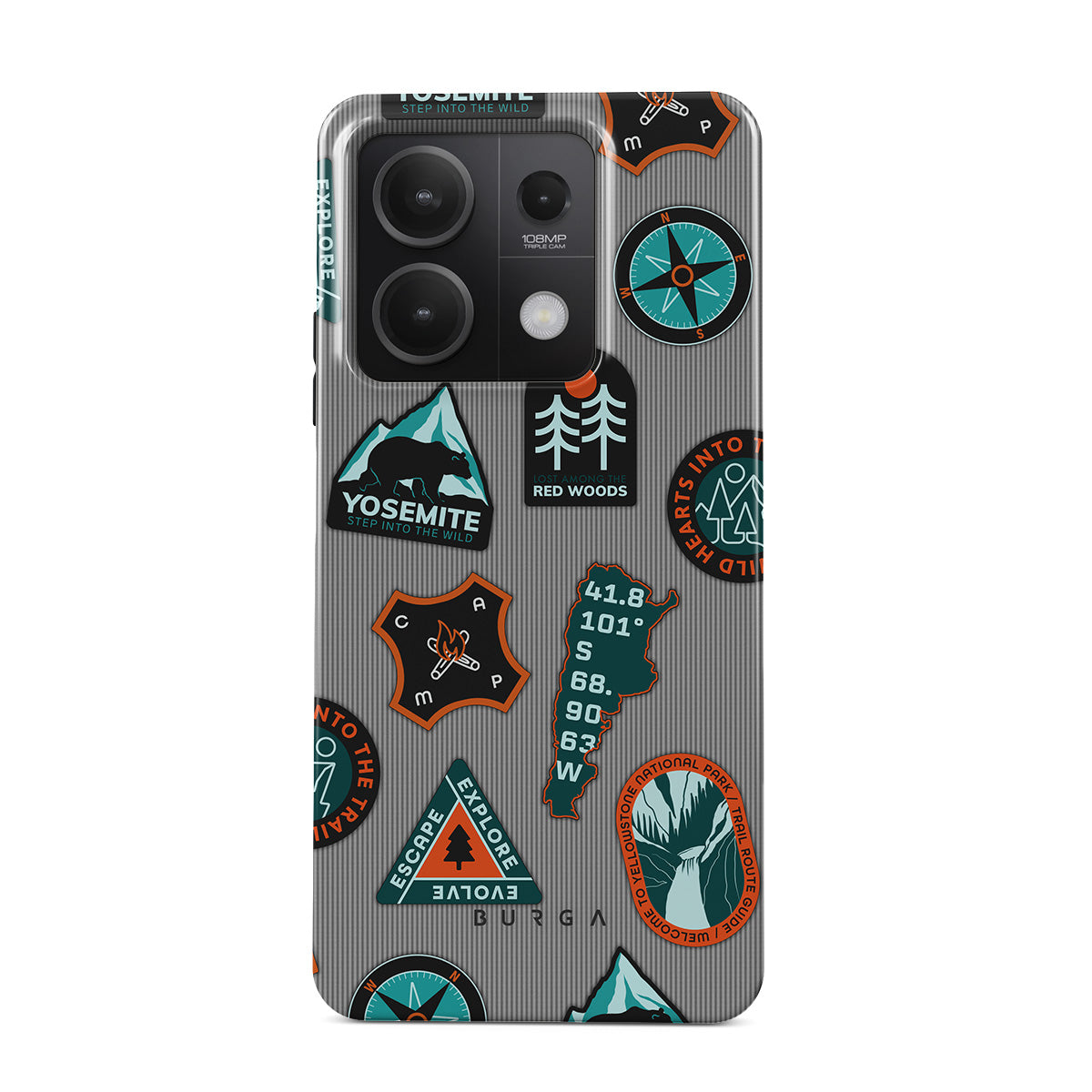 Kenmerken van dit design: outdoorpatches, natuur, bergen, avontuur, vintage, badges