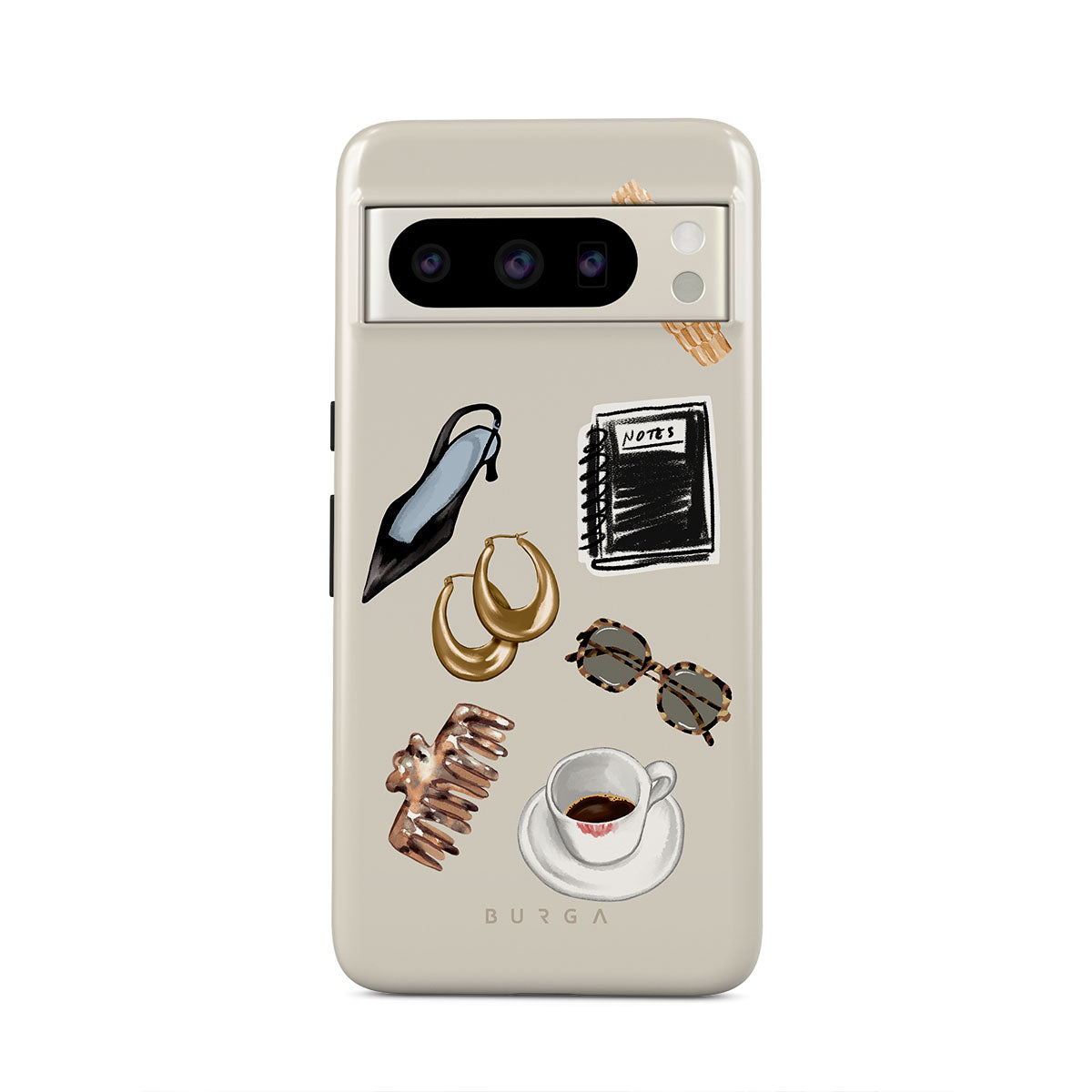 Kenmerken van dit design: zwarte hoge hak, gouden hoepeloorbellen, zwart notitieboekje, koffiebeker, schildpadprint bril, bruine scrunchie, retro gouden horloge.