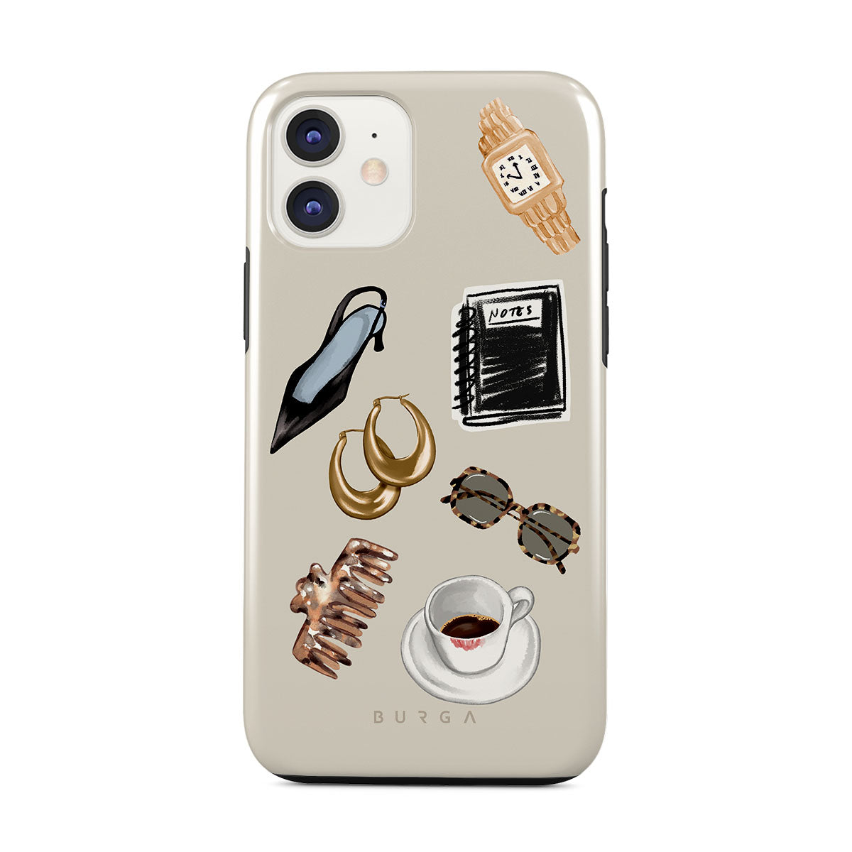 Kenmerken van dit design: zwarte hoge hak, gouden hoepeloorbellen, zwart notitieboekje, koffiebeker, schildpadprint bril, bruine scrunchie, retro gouden horloge.