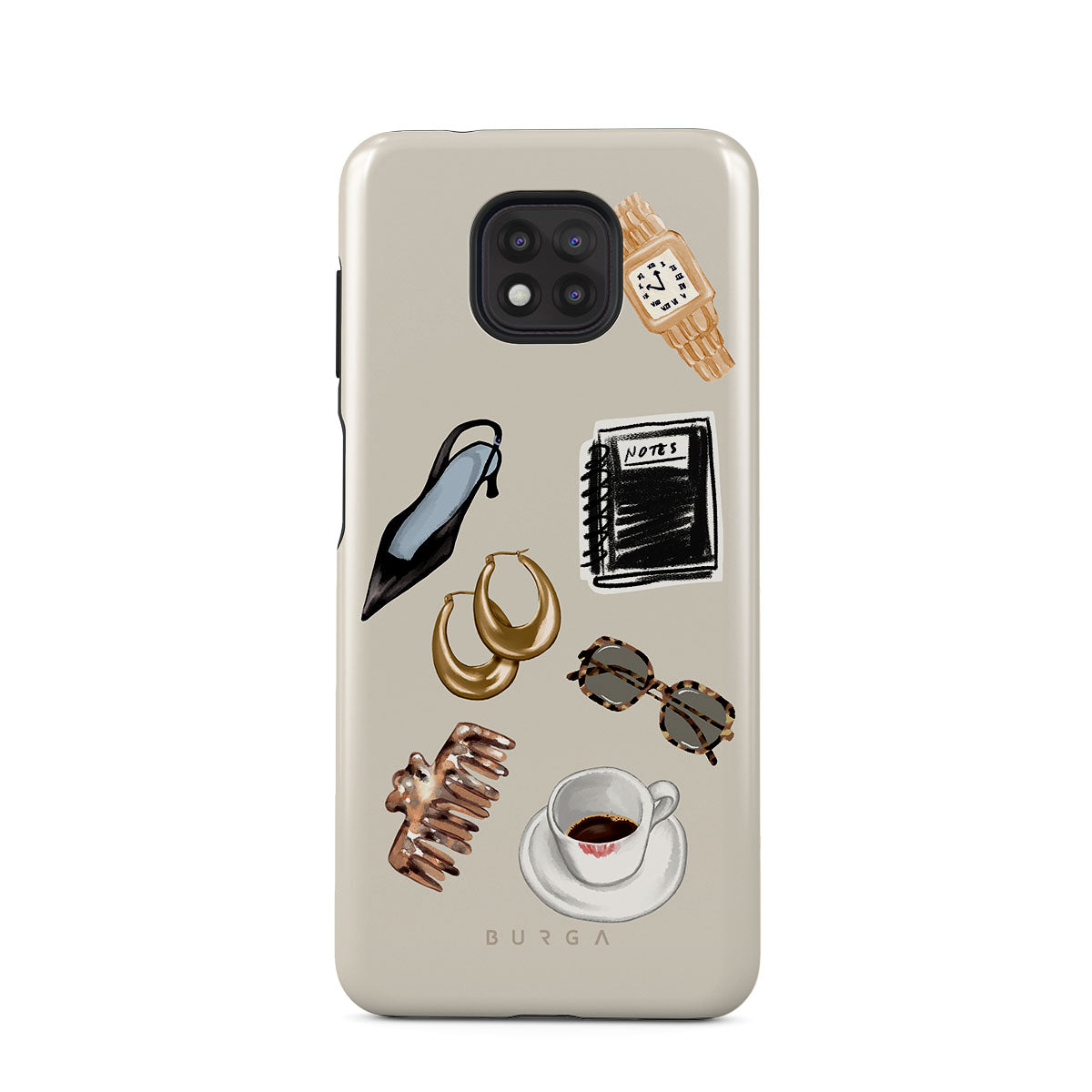 Kenmerken van dit design: zwarte hoge hak, gouden hoepeloorbellen, zwart notitieboekje, koffiebeker, schildpadprint bril, bruine scrunchie, retro gouden horloge.