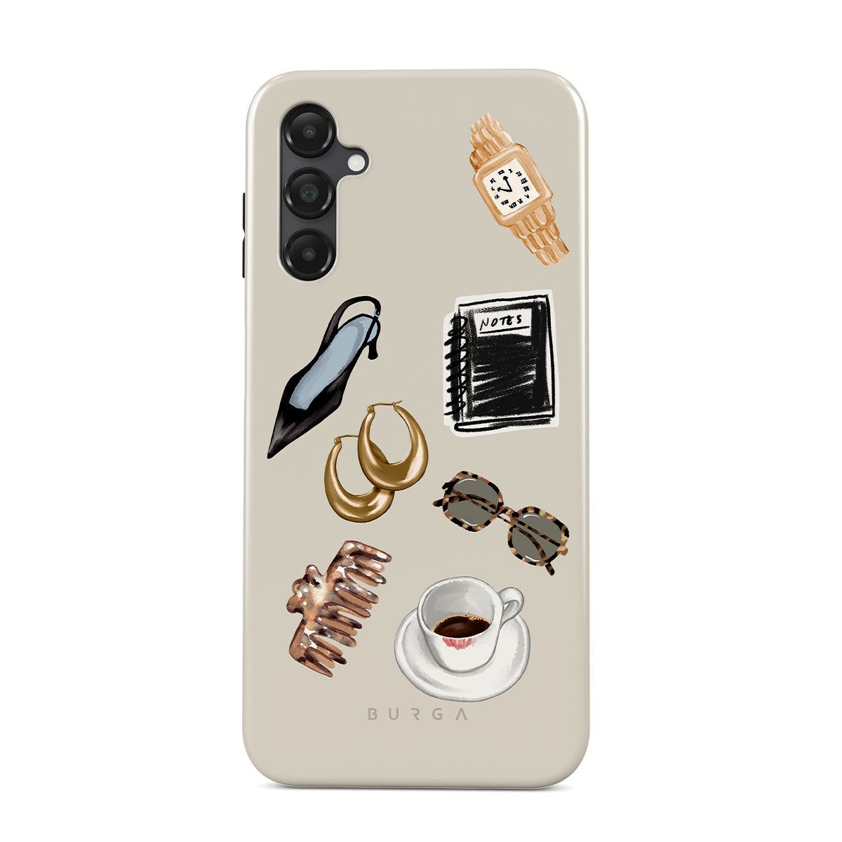 Kenmerken van dit design: zwarte hoge hak, gouden hoepeloorbellen, zwart notitieboekje, koffiebeker, schildpadprint bril, bruine scrunchie, retro gouden horloge.