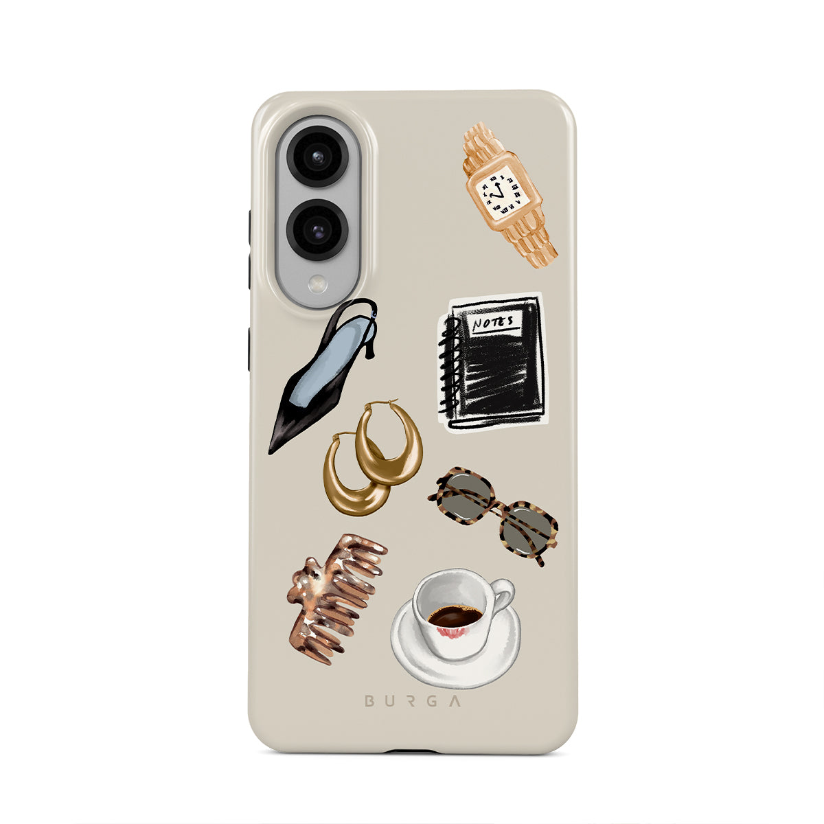 Kenmerken van dit design: zwarte hoge hak, gouden hoepeloorbellen, zwart notitieboekje, koffiebeker, schildpadprint bril, bruine scrunchie, retro gouden horloge.
