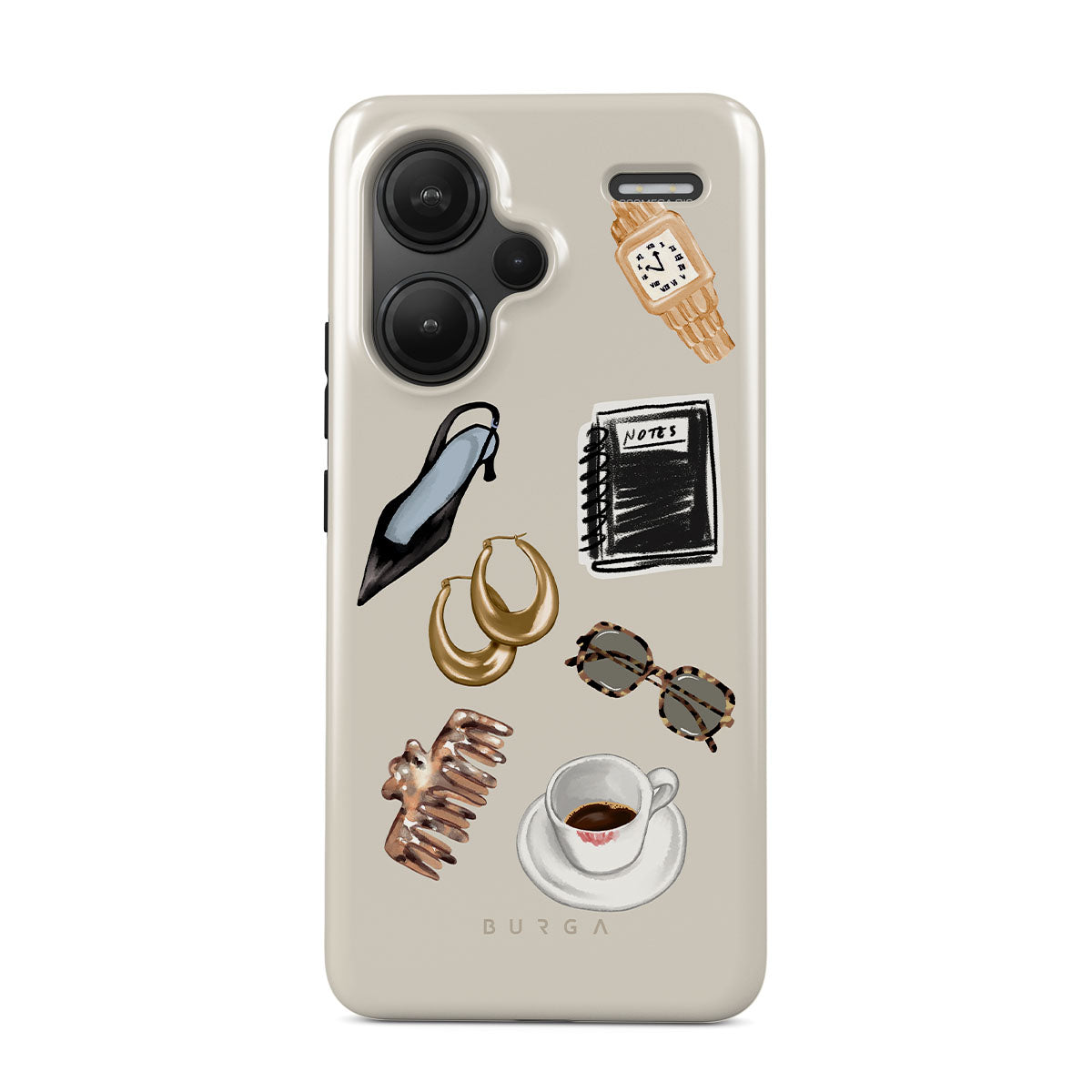 Kenmerken van dit design: zwarte hoge hak, gouden hoepeloorbellen, zwart notitieboekje, koffiebeker, schildpadprint bril, bruine scrunchie, retro gouden horloge.