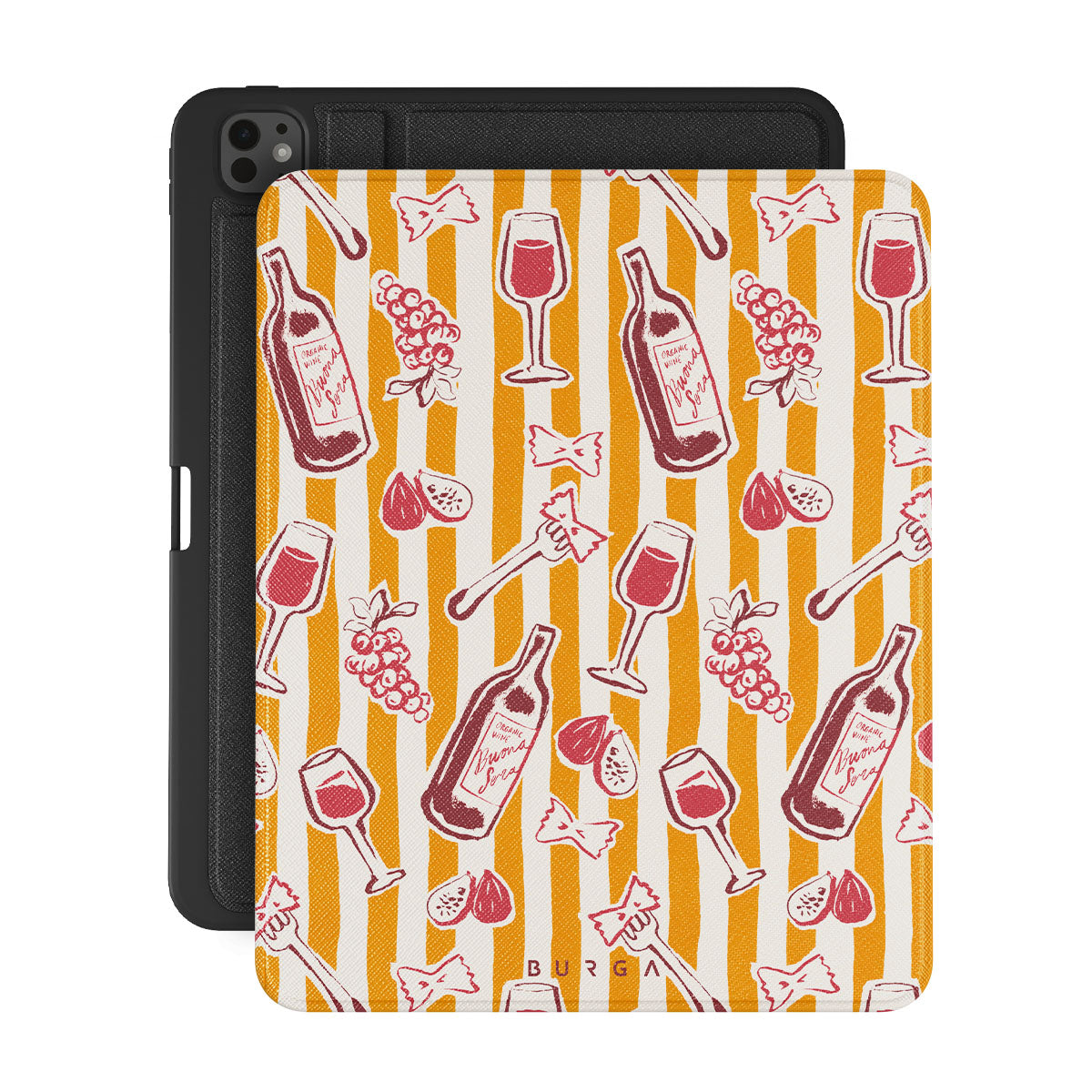 Kenmerken van dit design: fruit, vijgen, druiven, vorken, pasta, wijn, glas, strepen.
