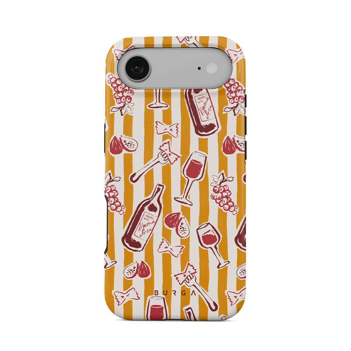 Kenmerken van dit design: fruit, vijgen, druiven, vorken, pasta, wijn, glas, strepen.
