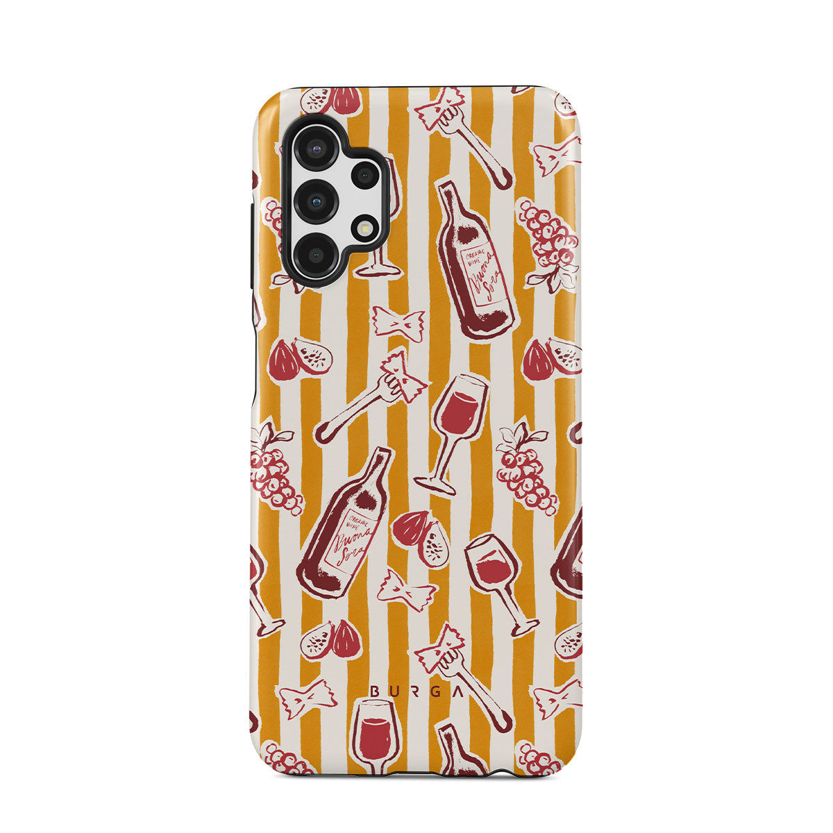 Kenmerken van dit design: fruit, vijgen, druiven, vorken, pasta, wijn, glas, strepen.