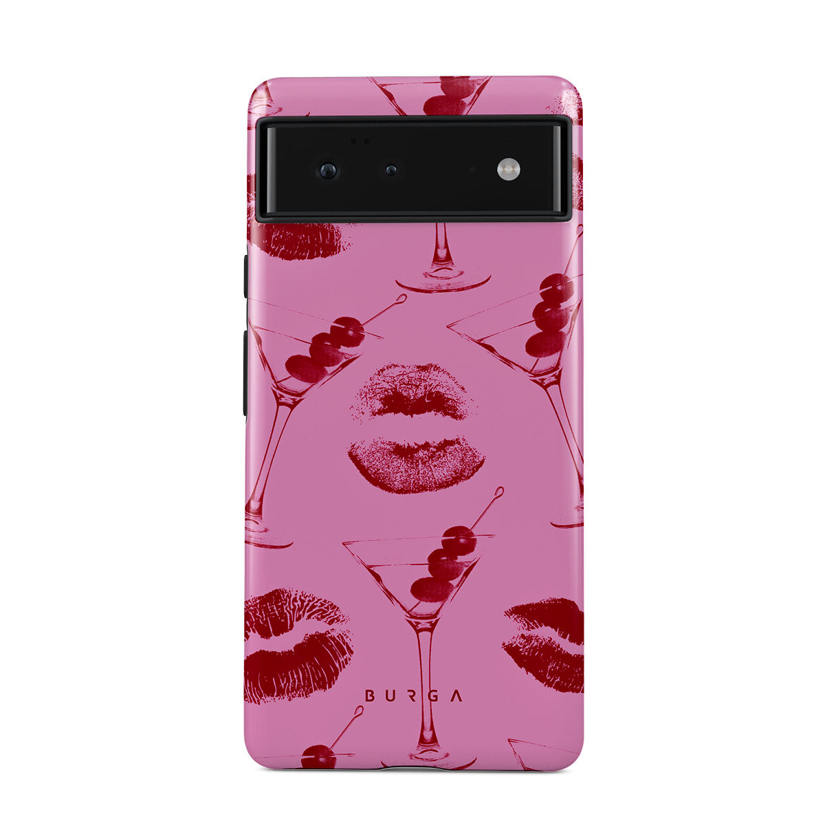 Kenmerken van dit ontwerp: rode lippen, kussen, cocktailglazen, martini's.