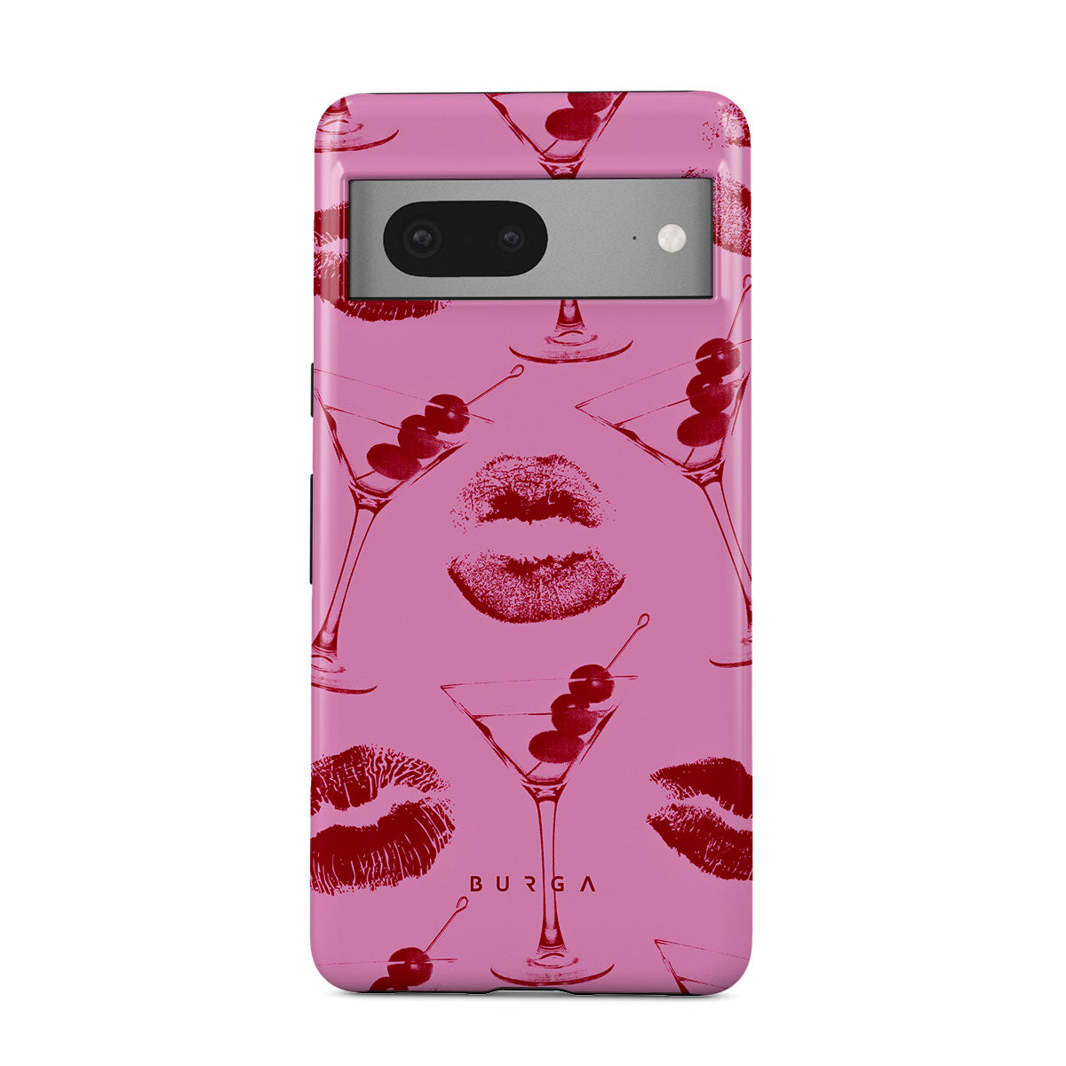 Kenmerken van dit ontwerp: rode lippen, kussen, cocktailglazen, martini's.
