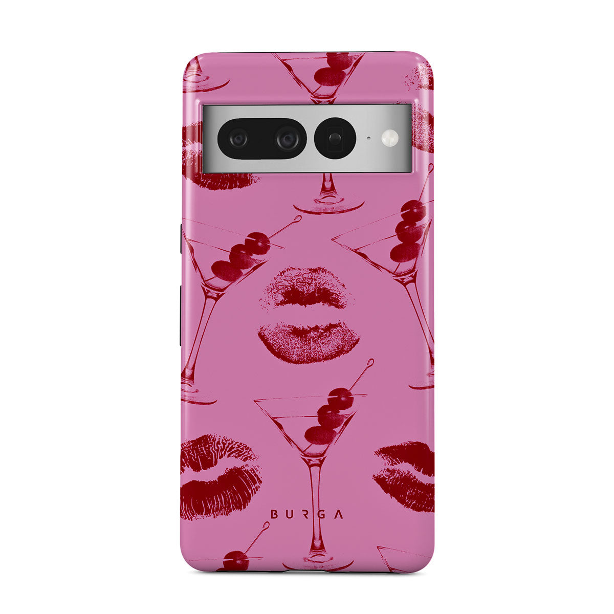 Kenmerken van dit ontwerp: rode lippen, kussen, cocktailglazen, martini's.