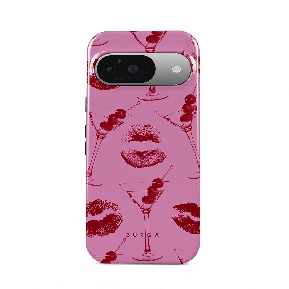 Kenmerken van dit ontwerp: rode lippen, kussen, cocktailglazen, martini's.