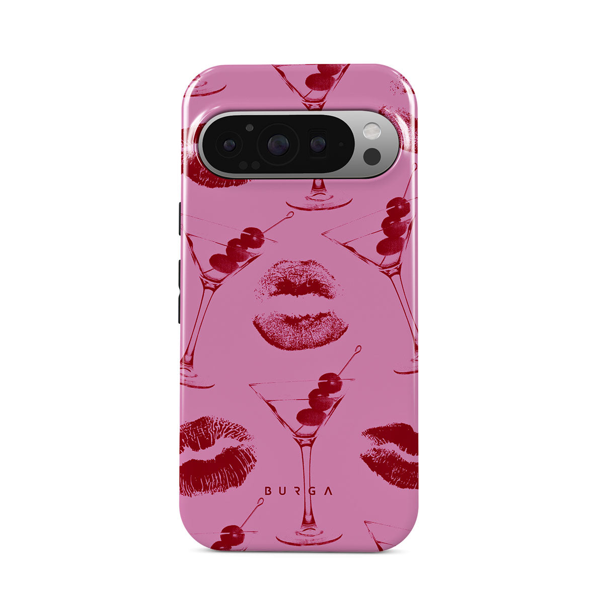 Kenmerken van dit ontwerp: rode lippen, kussen, cocktailglazen, martini's.