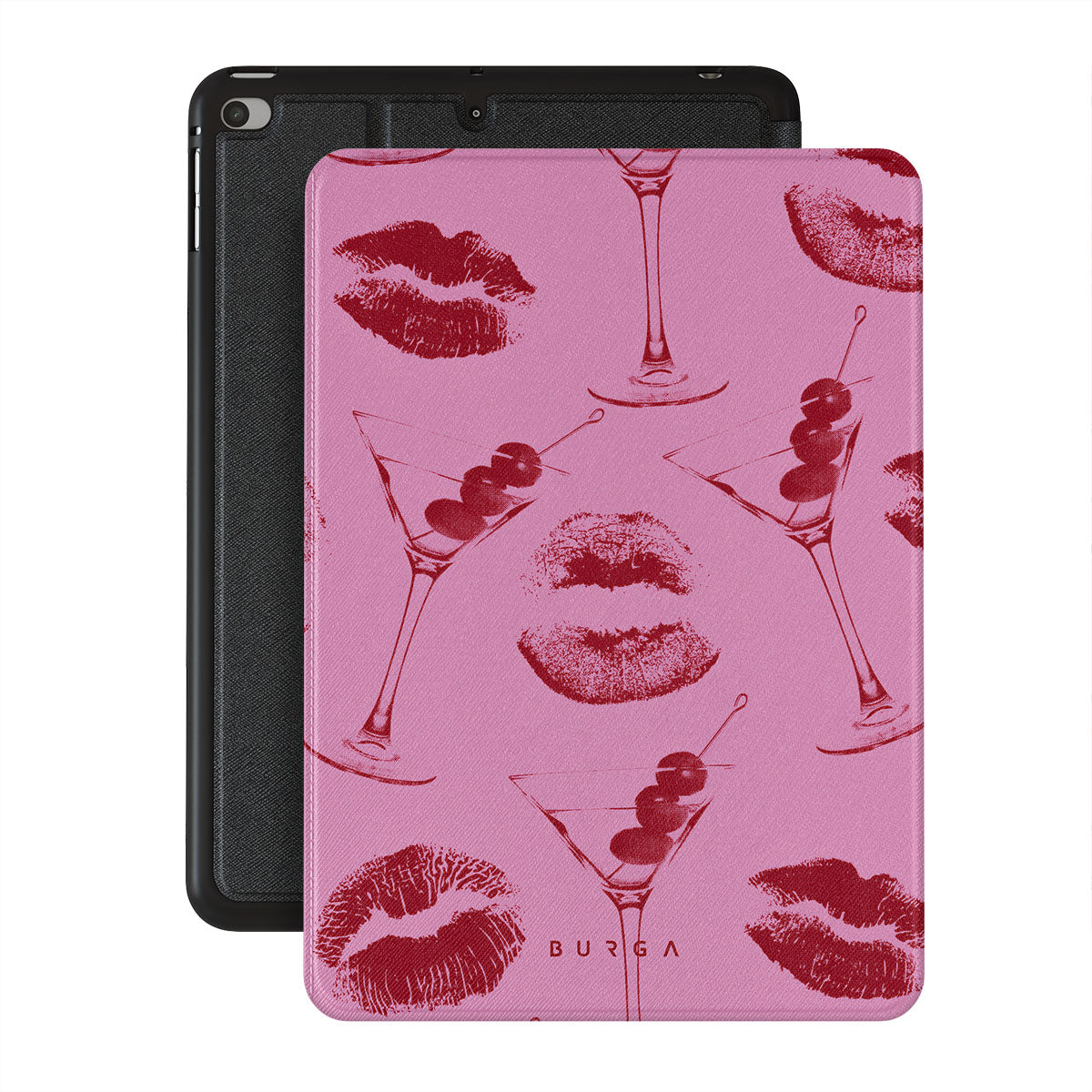 Kenmerken van dit ontwerp: rode lippen, kussen, cocktailglazen, martini's.