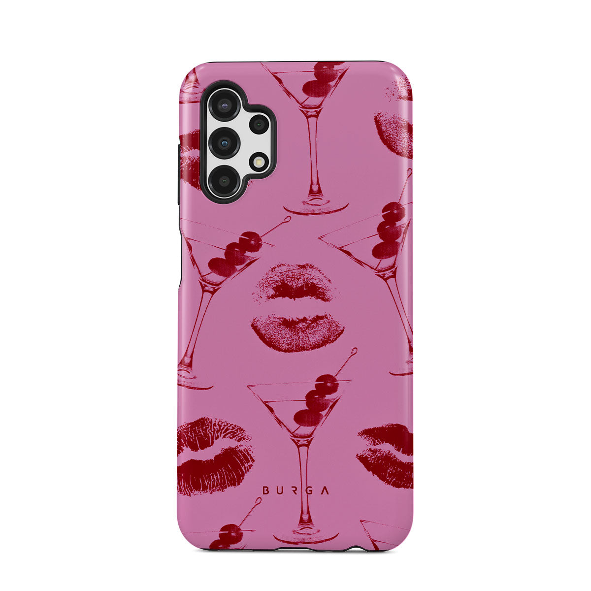 Kenmerken van dit ontwerp: rode lippen, kussen, cocktailglazen, martini's.