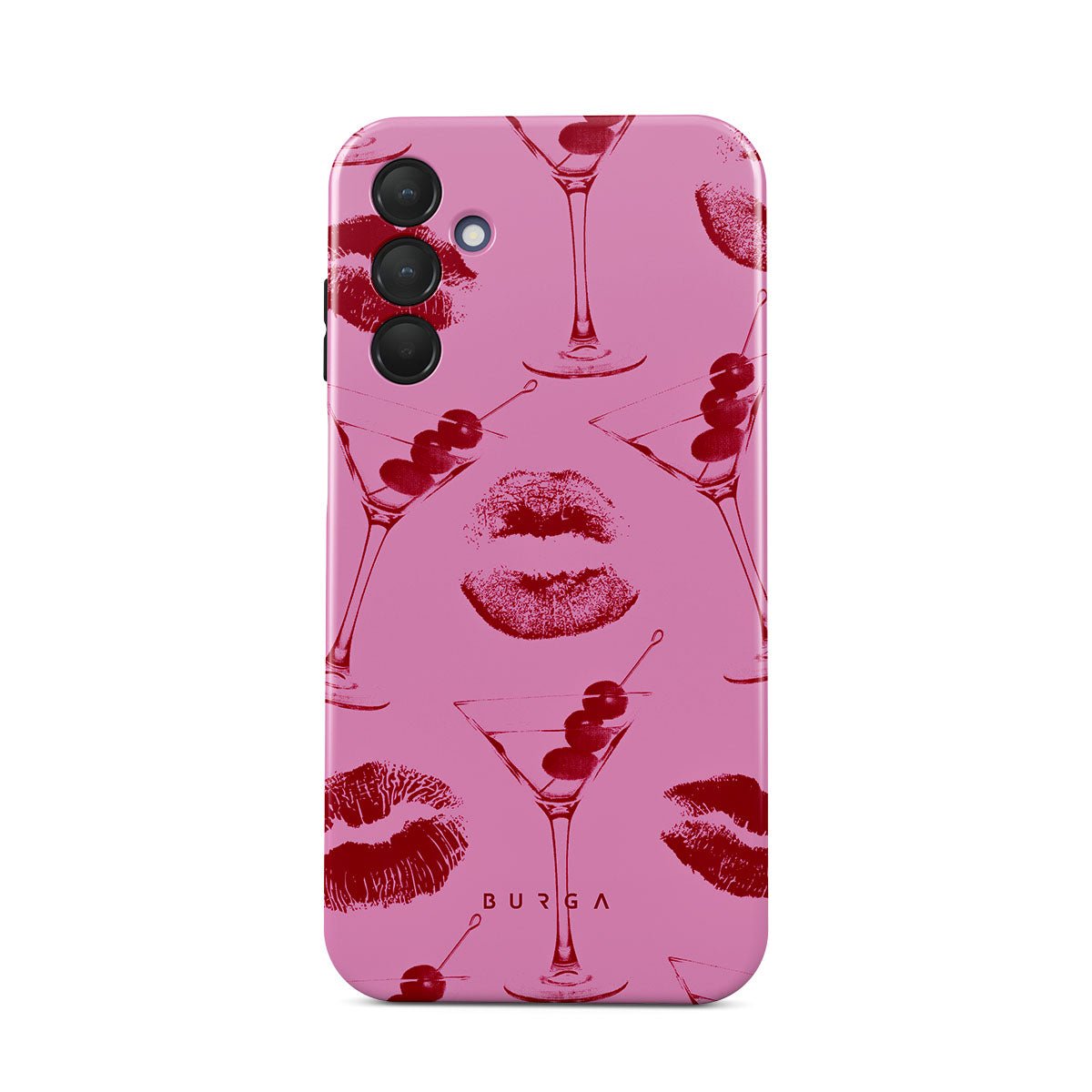 Kenmerken van dit ontwerp: rode lippen, kussen, cocktailglazen, martini's.