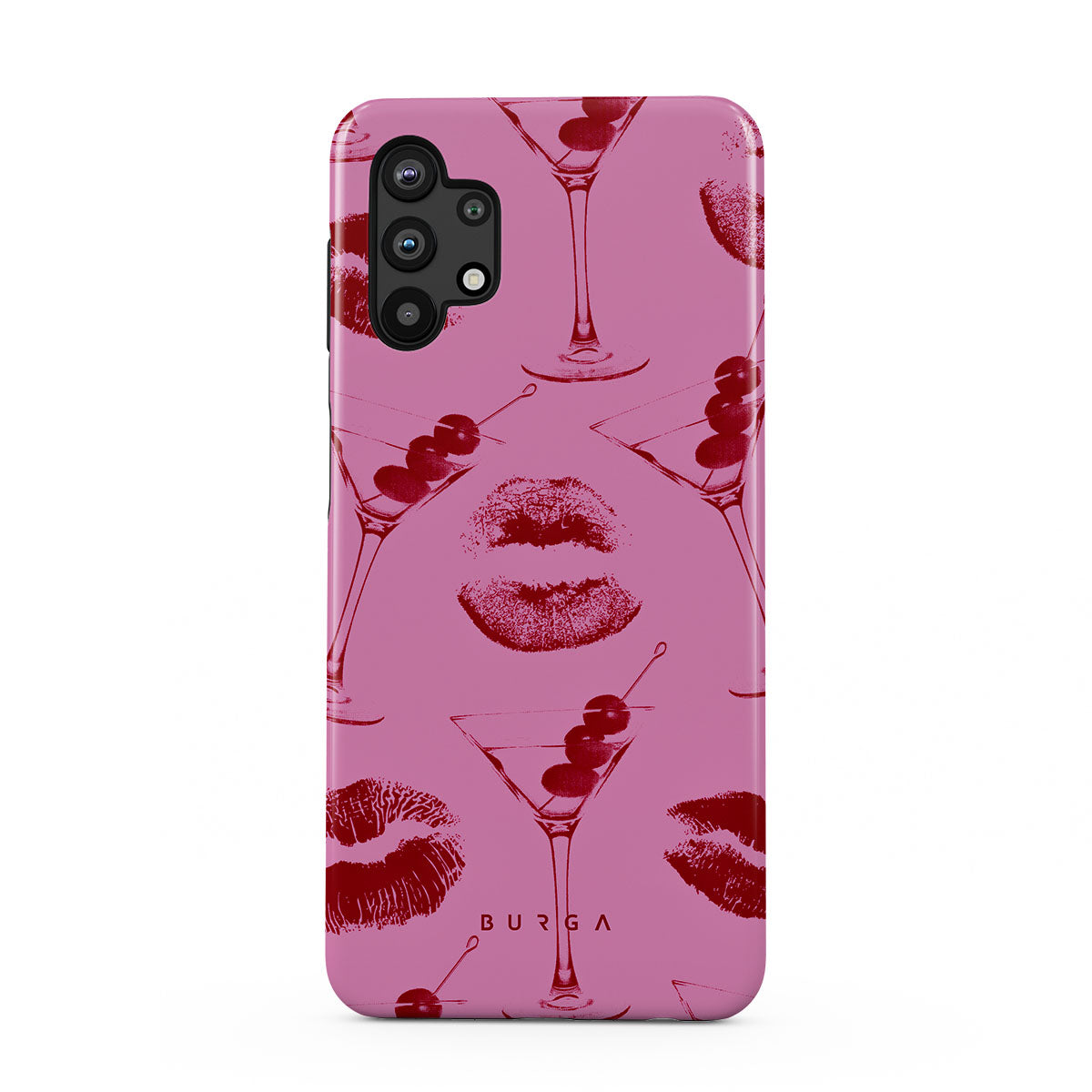 Kenmerken van dit ontwerp: rode lippen, kussen, cocktailglazen, martini's.